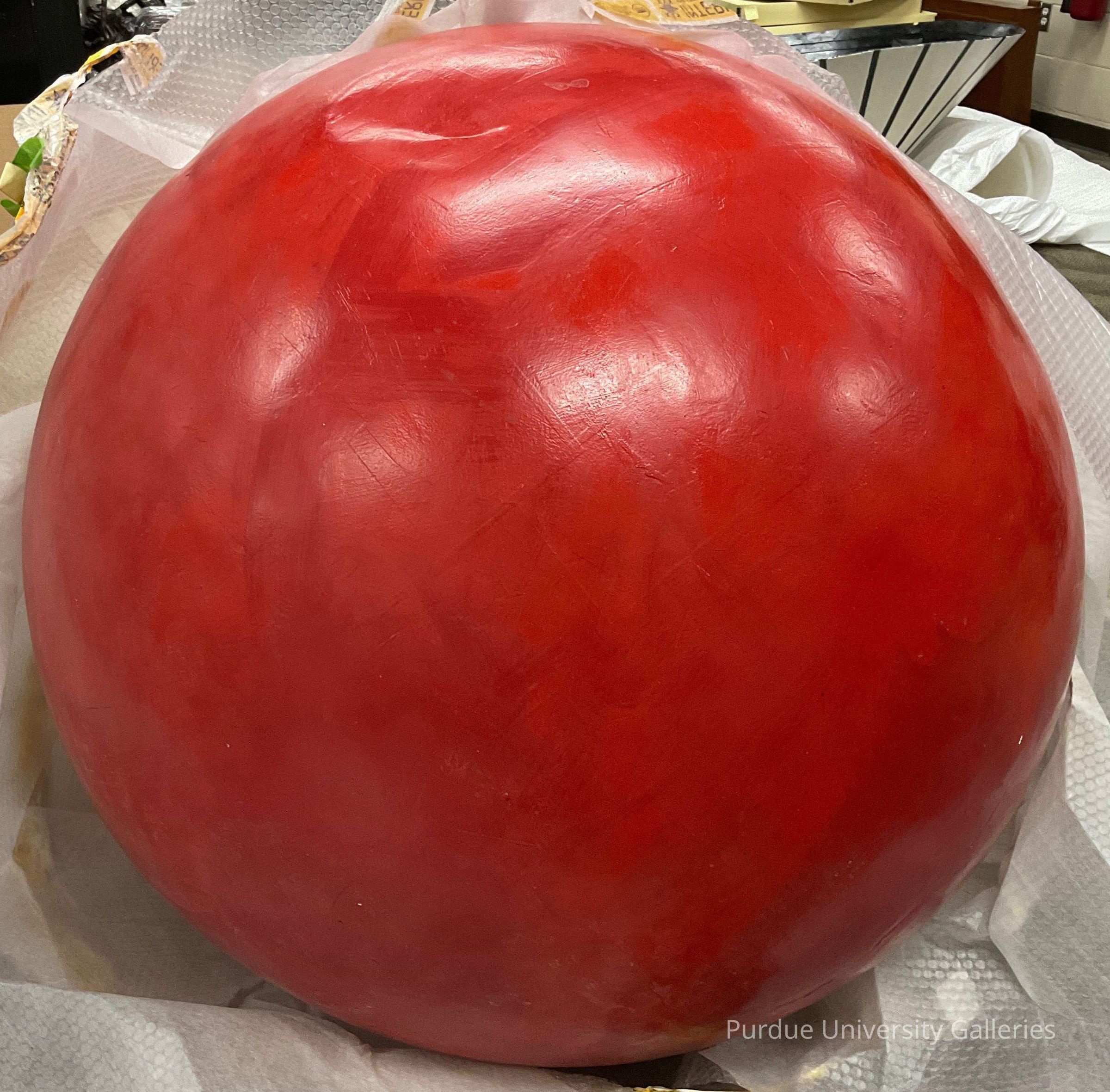 A) (37 1/2” H) Large, round sphere painted bright red. B) harness for hanging ball.