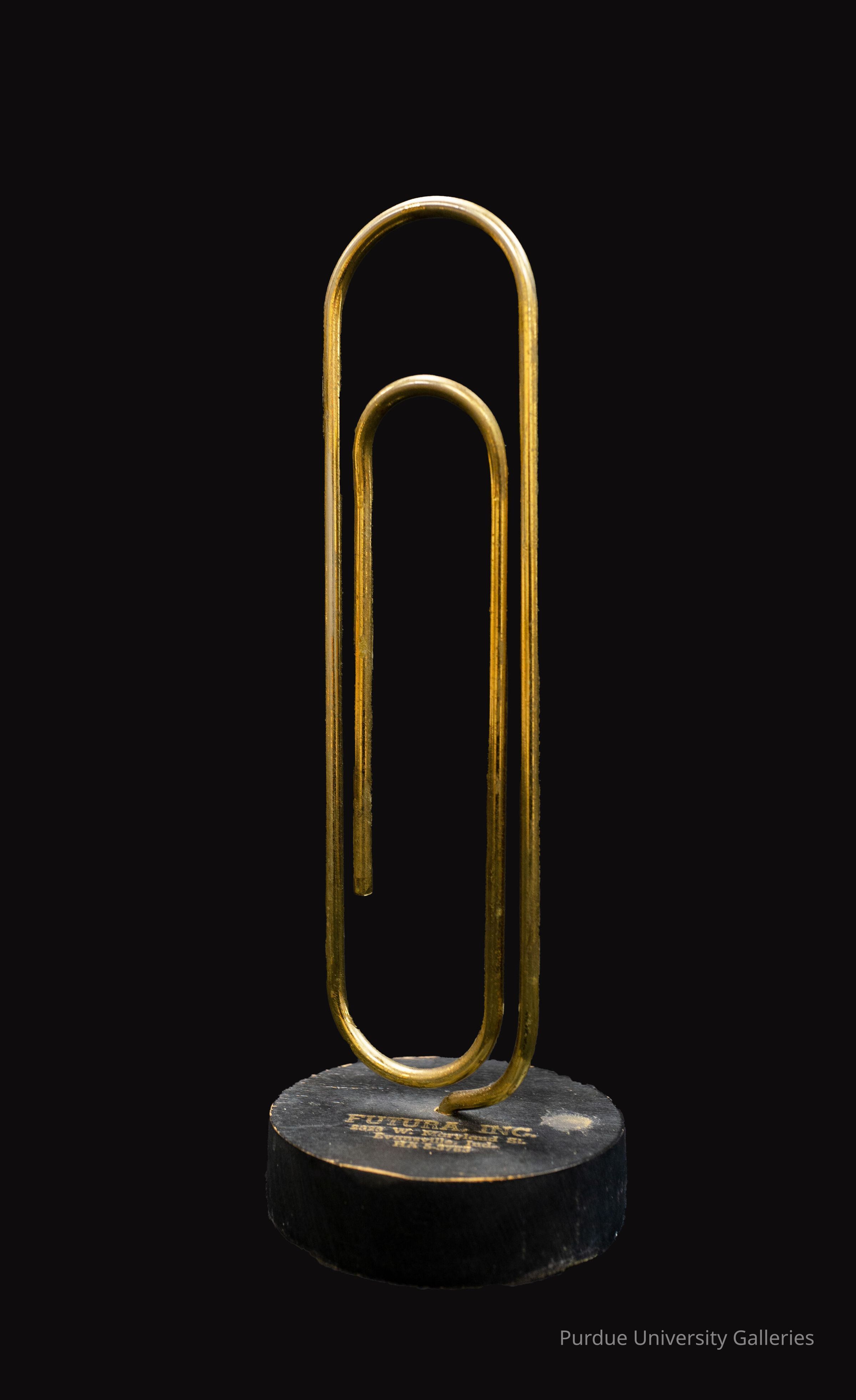 Oversized gold paperclip attached to a round black pedestal with an engraving.Acquisition