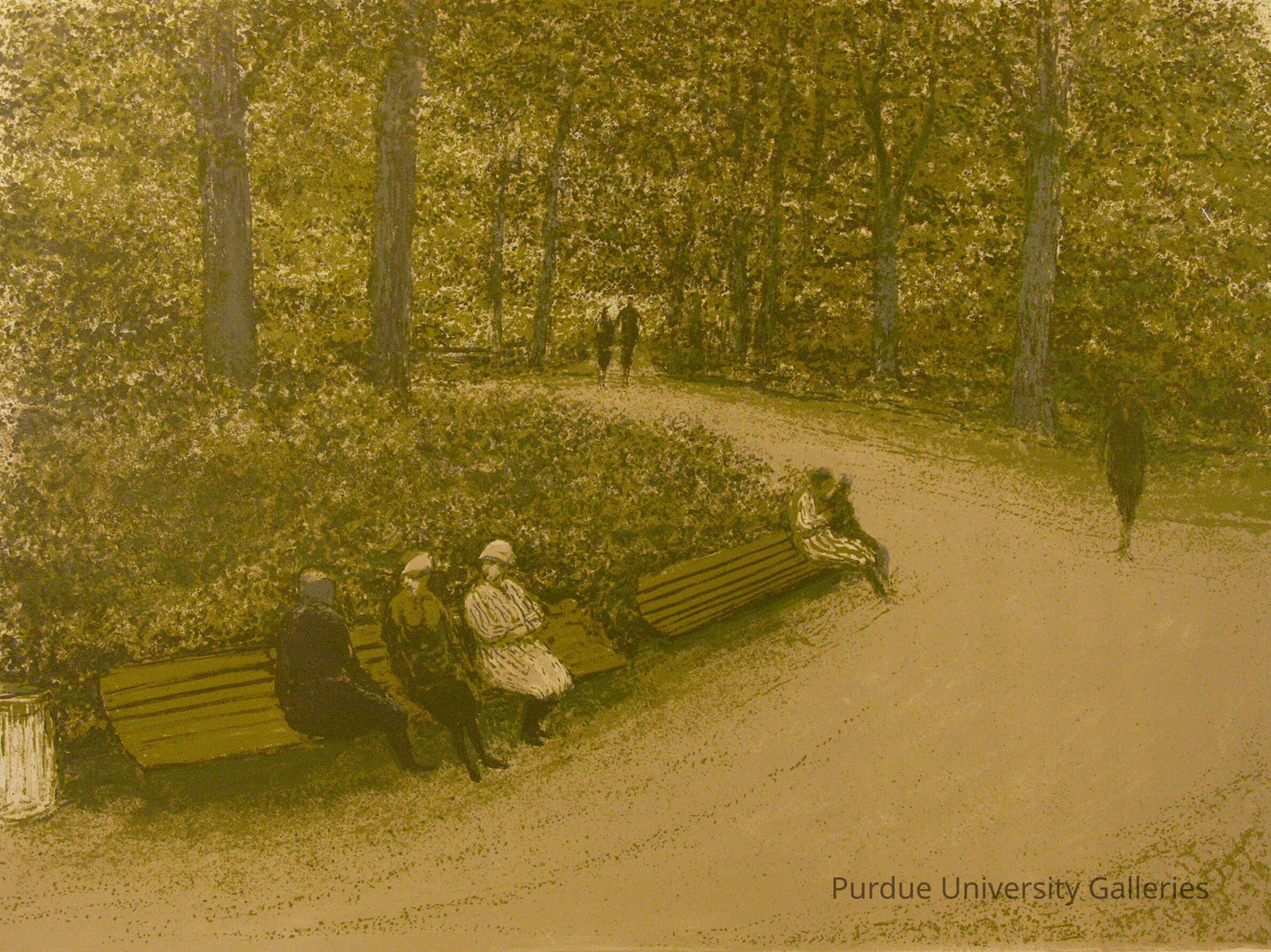 This screen print of Park Benches is typical of Altman’s work. Many of his prints represent park scenes and continue to be sold in America and Europe. In the mid- to late twentieth century, Altman made numerous prints of Central Park in Manhattan and other parks in New York and Pennsylvania. His images generally show a great number of trees surrounding a path or pond, and in this case, we see several benches with seated and walking people. His works rarely contain more than a few figures, and this print is unusual in including seven. His focus is primarily on aspects of landscape, and the serigraph technique allows for excellent rendering of lighting. This is clearly visible at the points where light shines through the leaves and onto the figures and foliage. Shadows are cast in a deep green, and there is little if any pure black. Altman’s use of limited color (mostly greens and browns), combined with a lack of detail in the figures, creates a picture concentrating mainly on the setting. It is difficult to place Altman’s work within a specific stylistic movement. His prints are reminiscent of the pointillist style of French Post-Impressionism. At the same time, there is a romantic element present, because his works express pleasurable emotion effectively.