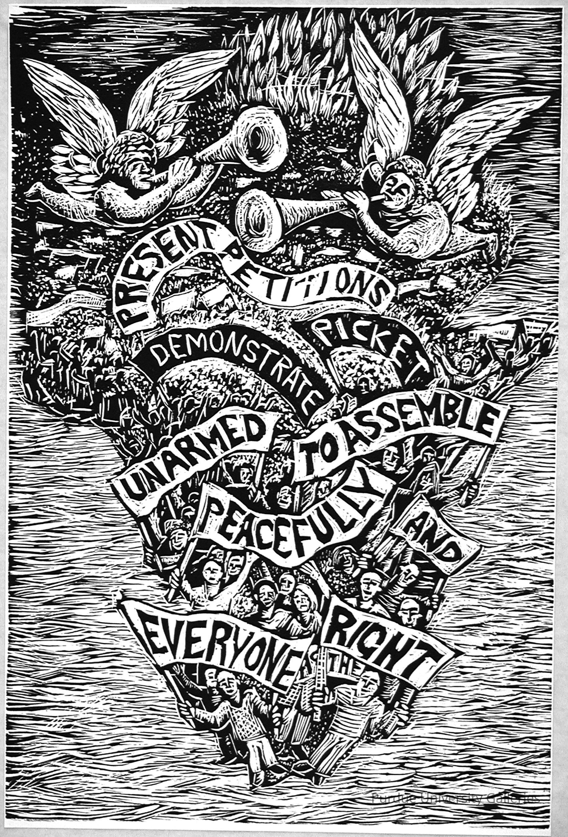 "(The Right to…) ASSEMBLY, DEMONSTRATION, PICKET & PETITION John Roome Durban/KwaZulu-Natal woodcut “Everyone has the right, peacefully and unarmed, to assemble, to demonstrate, to picket and to present petitions.” "