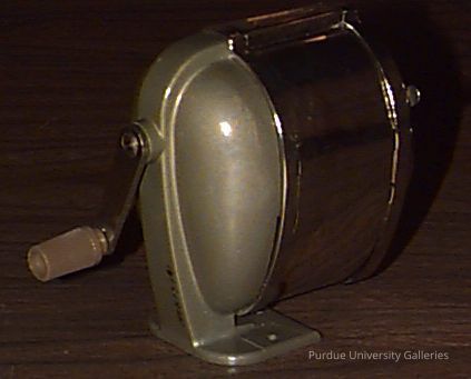 Silver-colored metal, manual pencil sharpener with a brown plastic grip. "BOSTON KS" is inscribed onto the side of the pencil shavings holder.Collection