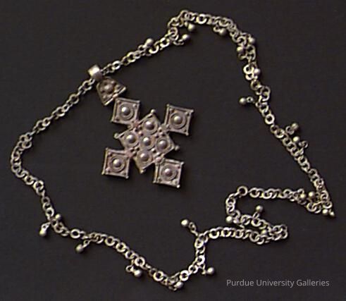 This hard edged pendant is a variaton of the ""arrow cross"" design, which symbolizes ""expansion in all directions"". Its reference to ""movement"" typifies the Afghans' historically nomadic culture."