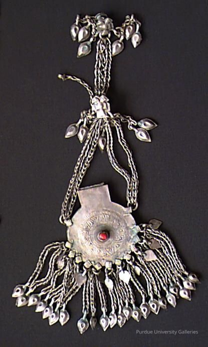 "Pendant type container with coral colored bead. The ""double-headed eagles"" at the top and several inches below are studs designed to be attached to an outer garmet. The container's flush topped lid lifts off. "