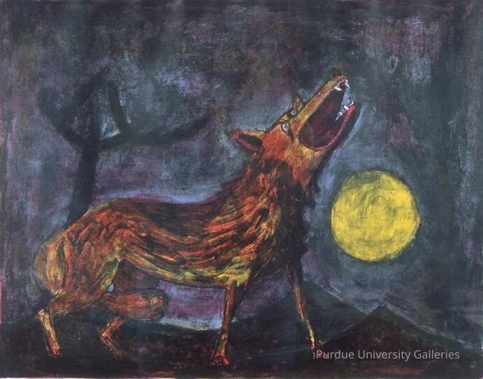 Tamayo’s lithograph, Perro Aullando a la Luna shows a dog with his neck stretched back and teeth barred as it howls at the moon towards an otherwise empty night sky. A lone tree stands in the background towards the left side of the lithograph balanced by an unusually large full moon on the right. The perspective inaccuracy of this work is emphasized by the scale of the dog in relation to the distant landscape. Two peaks of dark, distant mountains stand between the dog and the moon while a cosmic abyss of tenebrous blues, purples, and blacks consume the seemingly infinite night sky. The agonized expression of the dog contributes to the overall feeling of despair dominating the print. This sentiment is emphasized even more so by the animal’s isolation in an empty, infinite space. The overall feeling provoked by this composition is accentuated by the raw texture which gives the work tangible materiality. The materiality recalls the indigenous style that Tamayo connected with so deeply, where natural materials were used to create vibrant and earthy colors, evoking a sense of physicality in the art. Rooted in nativist Mexican tradition, Tamayo’s style creates a form of interpretation that becomes universally understood across all cultures. Tamayo’s fusion of native Mexican landscape with modern formalism, such as shape and color, introduced a new form of Mexican art into contemporary aesthetic standards.