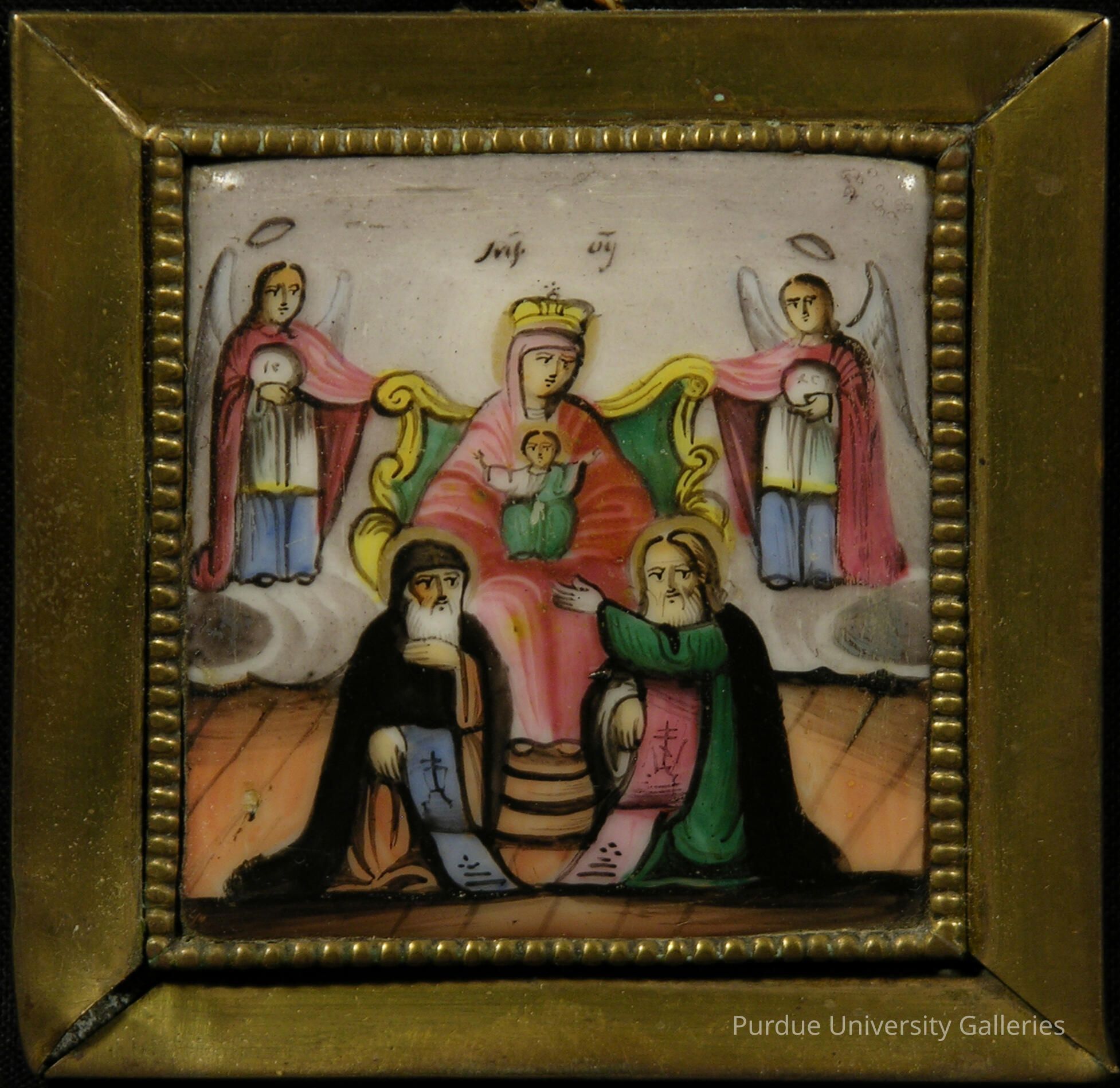Iconographic painting done on enamel ceramic tile (finift) with (brass?) metal border. The front of the icon shows the Mother of God seated on a green and gold throne clothed in pink maphorion veil, pink robes, and a gold miter crown holding a small Christ child who wears green and white. Seated at the Mother of God's feat are two male figures, both with long white beards. One has a black maphorion veil and blue stole and the other has an uncovered head with green robe and pink stole. The throne is flanked by two angels identically clad in pink capes, white tunics, and blue robes. Both have thin halos, white wings, and shoulder length hair. The angels carry circles bearing the Greek IC XC symbols of Christ, and a different caption sits above the Mother of God's head. On the reverse side of the icon is a black Cyrillic Russian caption on solid white enamel.Type of Painting