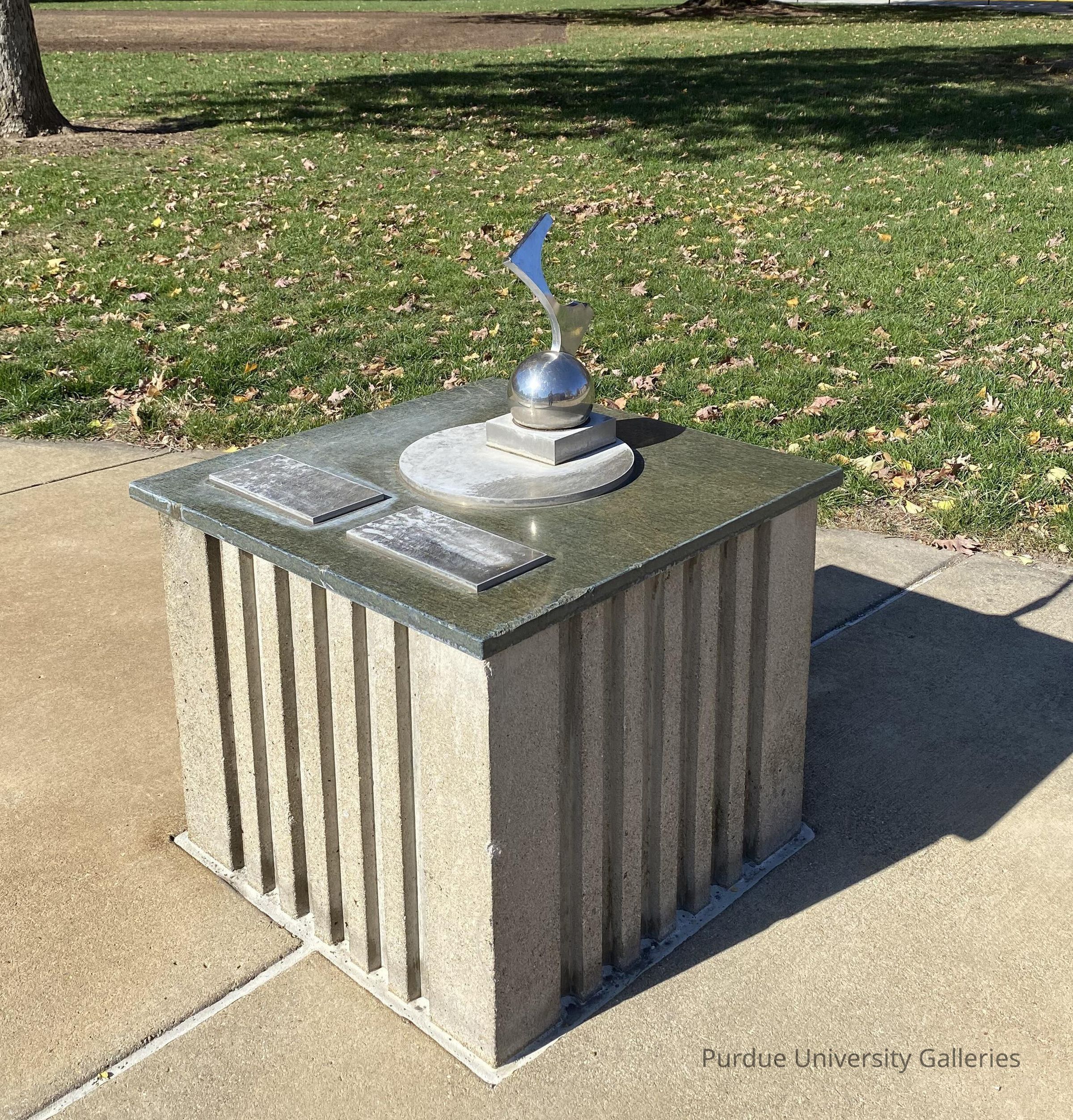 sundial made up of a sphere, circle, box, and curved rectangle with half circle cut out of it. pedestal is a very rectangular fluted collum.Lexicon