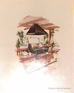 Photograph of concept drawing of a grill built into a wood, outdoor counter. A turkey is on the grill.