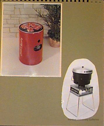 Two photographs of novel grills. The first is a round, red grill with "Town and Country" stenciled in white on th eside. The second is a b/w photo of a grill sitting on a table which is marked "Town and Country."
