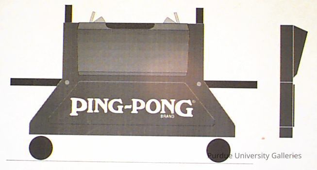 The side face of the ping-pong table prototype drawing. It is printed in black-and-white. It says "PING-PONG BRAND" on it. There is a side view on the left-hand side of the paper.