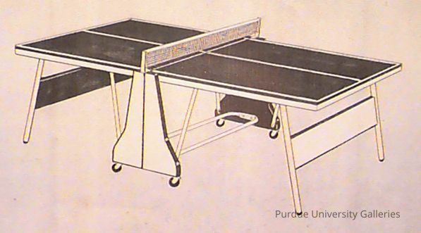 Black and white copy of a concept drawing for a ping pong table. There is a handwritten "7" on the bottom right side.
