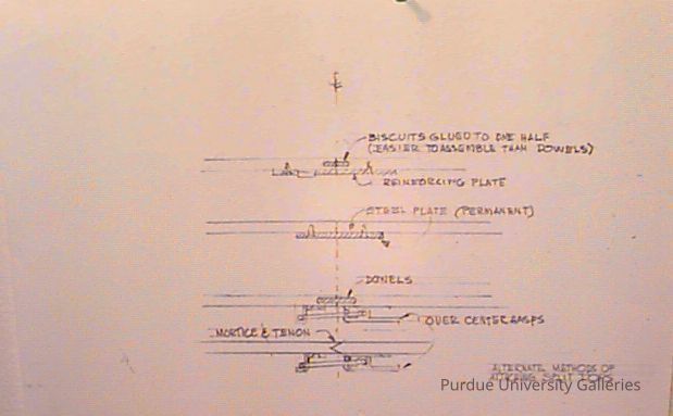 Enlarged, printed copy of 1997.03.117.38. Might be a drawing of "alternate methods of attaching split tops". Concept drawings of reinforcement parts for a ping pong table. There are labels, such as "steel plate (permanent)".