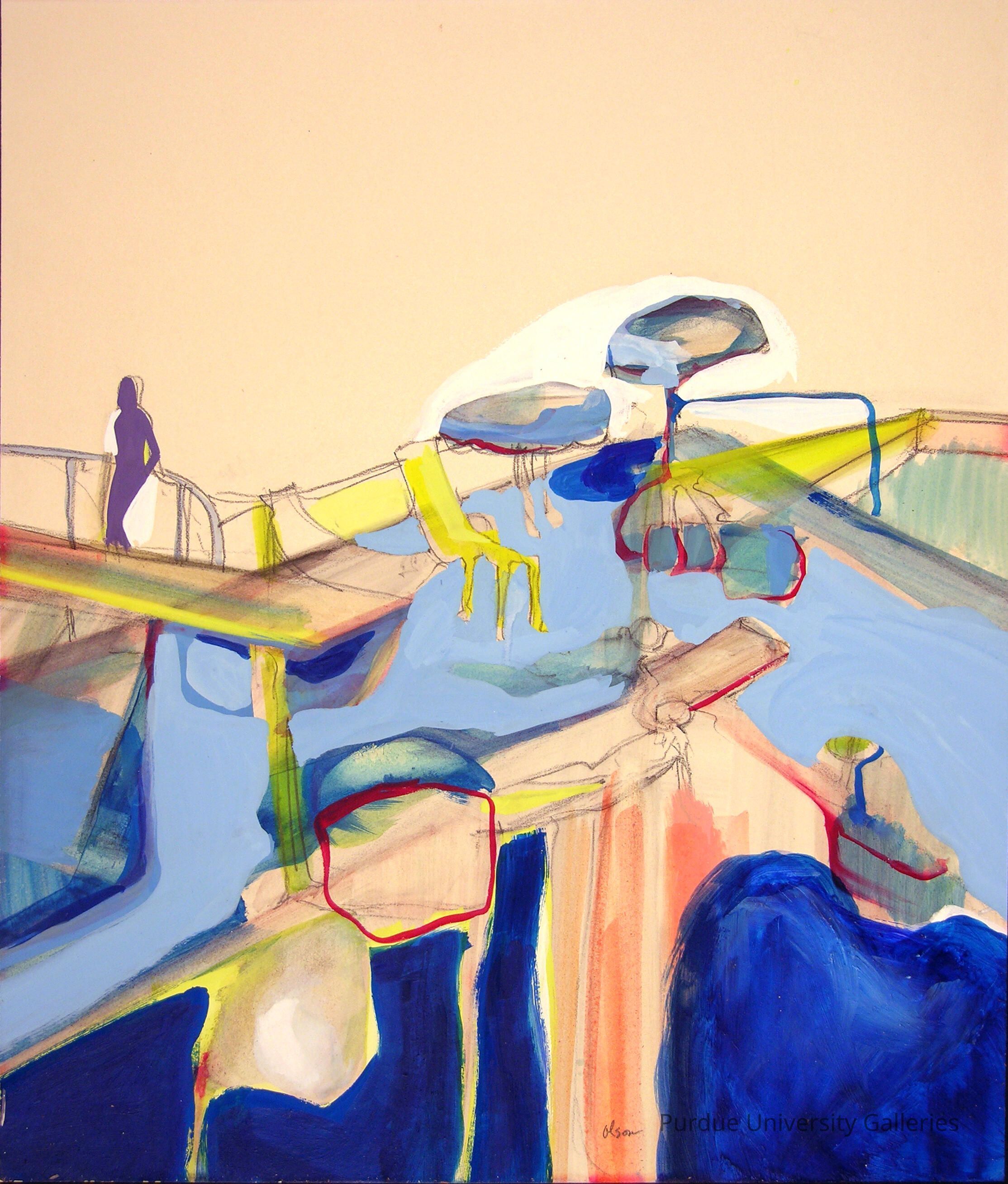 Watercolor or gouache piece showing an abstract scene of a pool side. The thin lines give an odd visual weight to the scene. Everything is flat other than a few shadows. The perspective is strange seeing the world at an above swayed angle. The thin lines on the side of the pool gives the chairs, umbrellas and edge almost a human look to them, like a hand reaching out. There is a purple sihlouette of a figure to the left on a rail of the pool.