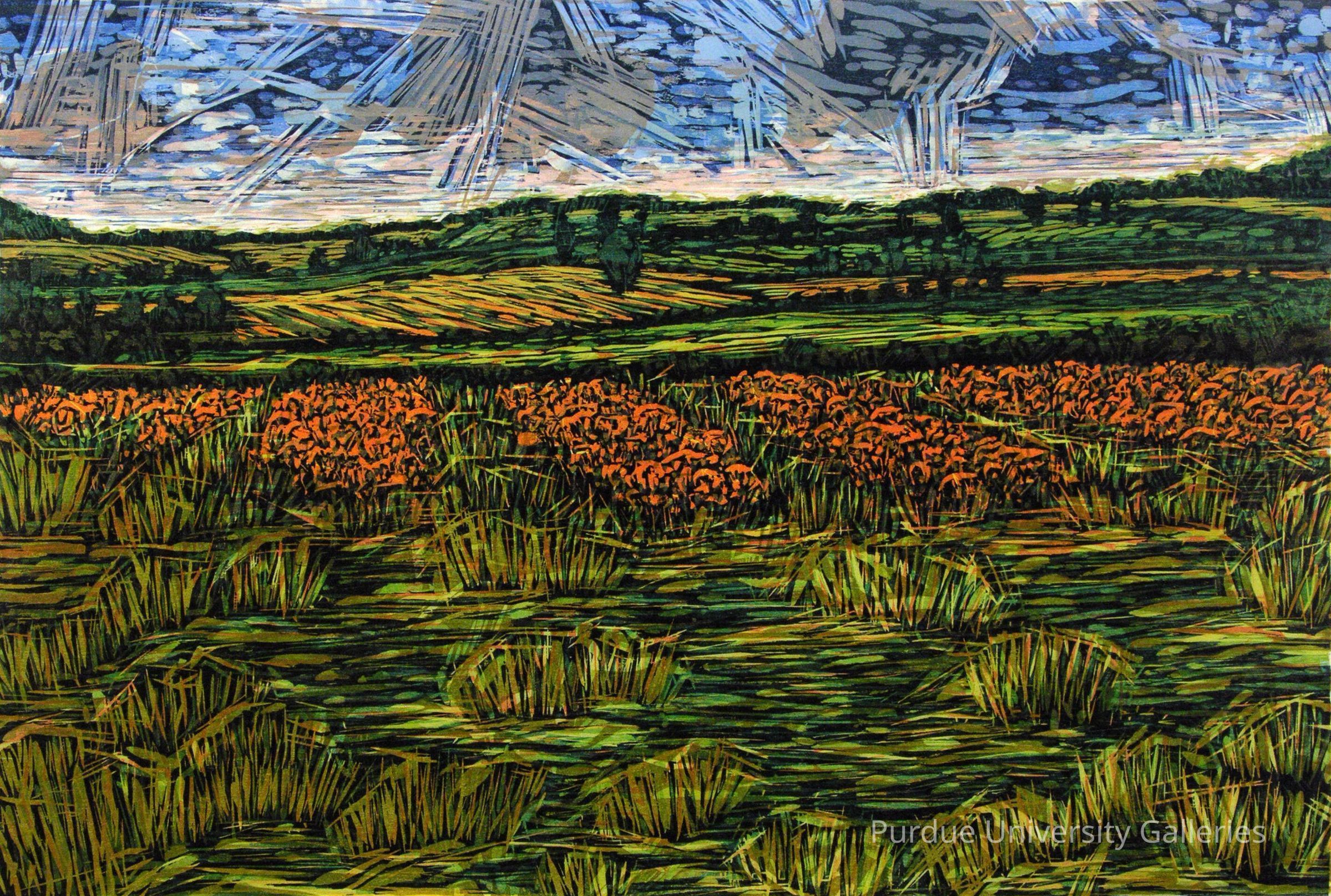 color woodcut. Foreground of green fields with orange flowers, and yellow and orange farmland in the background. The sky is blue with grey clouds.