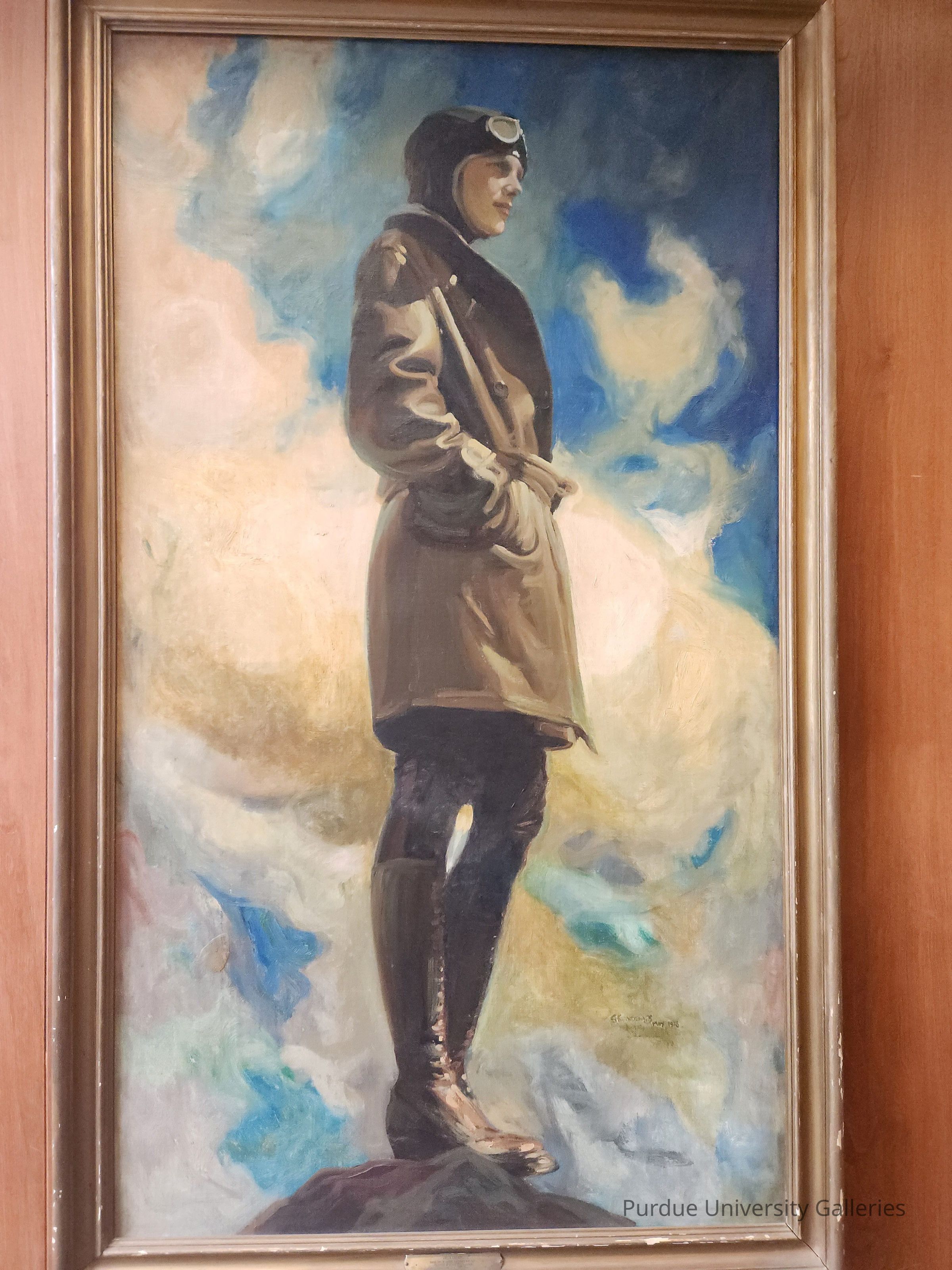 This painting was donated to Purdue University in 1939 by George Palmer Putnam (1887-1950), Earhart’s widower. The artist is Brynjulf Strandenaes (1890-1952), sometimes Anglicized as Bryn Strandenaes. Strandenaes was a Norwegian-American portrait painter who lived and worked in New York City. Here is a Purdue archives link to a 1928 photograph of him in the process of painting our Earhart portrait (https://earchives.lib.purdue.edu/digital/collection/earhart/id/754).
