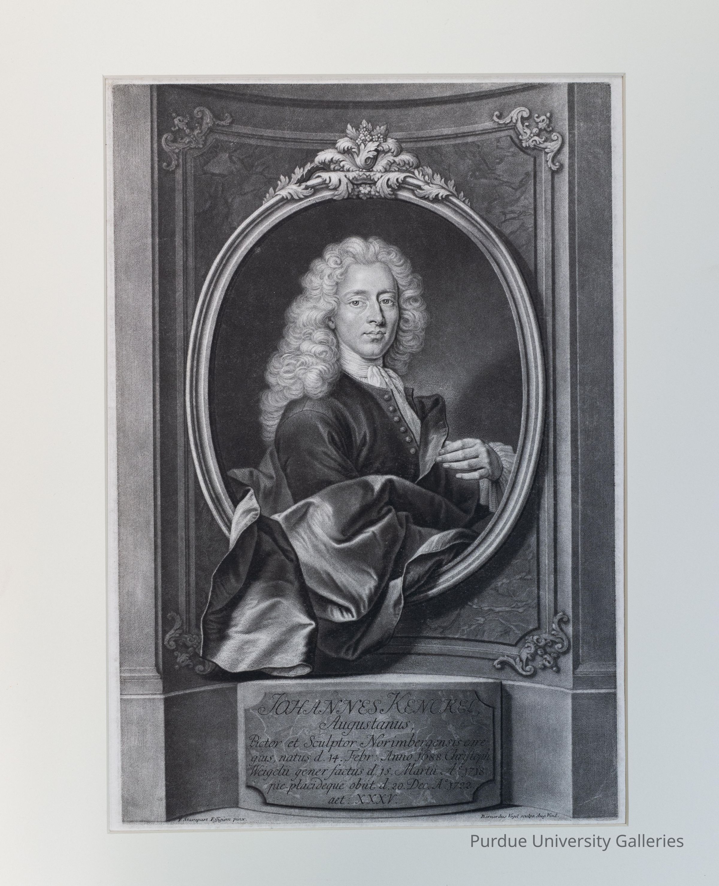 This is a portrait of the German painter and printmaker Johann Kenckel (1688-1722) likely produced as a memorial shortly after his death. At first glance it looks like an oval painting set inside an architectural niche, but the artist has added a flowing cloak that breaks the picture plane, playing with 2D and 3D. The plaque on the oval reads: “Johannes Kenckel, the Great. An eminent Painter and Sculptor from Nuremberg, born Feb. 14, 1688, son-in-law of Christopher Weigel died March 15, 1718, he died peacefully and peacefully. 20 Dec. 1722.” This work is a mezzotint, an intaglio process like engraving or etching, it produces rich, velvety tones seen here.