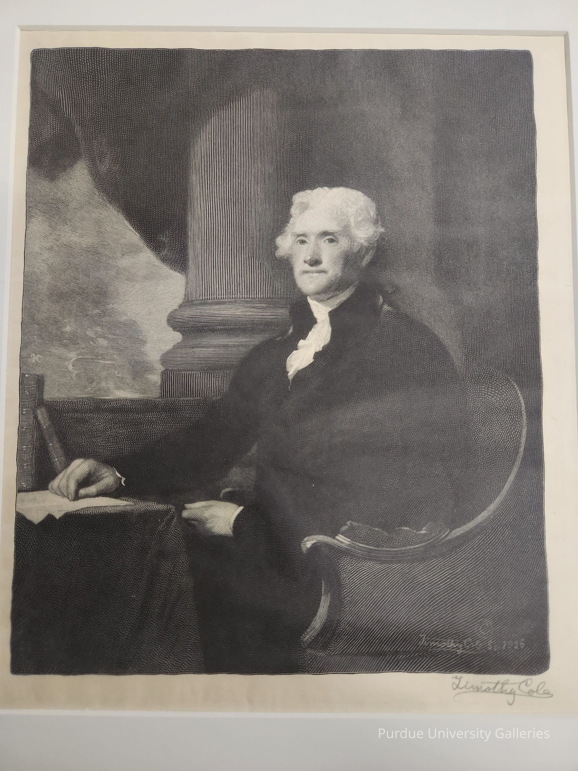 Timothy Cole was born in England before emigrating to the United States with his family at the age of five. There is no record of his education or artic training, but it is known that he operated an engraving studio in Chicago in the late 1860s. Following the Great Chicago Fire in 1871, he lost everything and decided to move to New York City where he was employed by the magazine Century. He worked as a wood engraver, carefully carving hardwood blocks using sharp chisels known as burins. The work is time-consuming, exacting, and extremely difficult. Despite cheaper reproductive technologies such as photography becoming increasingly prevalent, Cole maintained a reputation for excellence and his work was in great demand throughout his life. He was particularly noted for his ability to capture the likenesses of Old Master paintings. You can see the quality of Cole’s lines clearly in this print especially by comparing the soft, smoke-like treatment of the foliage on the left side of the image and the rigid lines incised on the column in the center. This piece is truly a masterclass on the abilities of a first-rate engraver. He possibly produced this work to mark the centenary of Jefferson’s death.