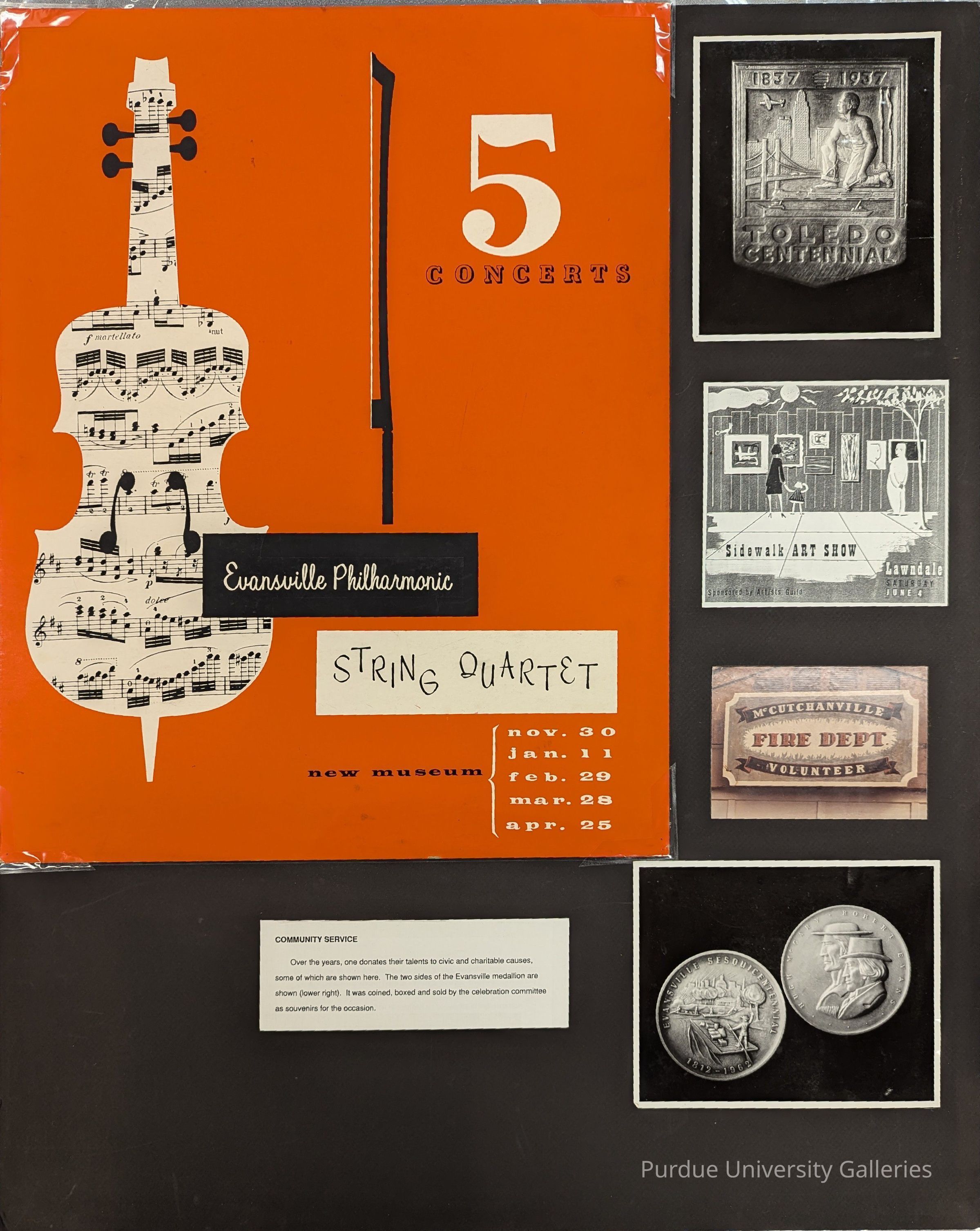 Poster about community service, with examples of the Evansville medallion, McCutchanville Fire Dept. Volunteer sign, a sidewalk art show, and the 1937 Toledo Centennial, and a large poster for the Evansville Philharmonic String Quartet's 5 concerts.Collection