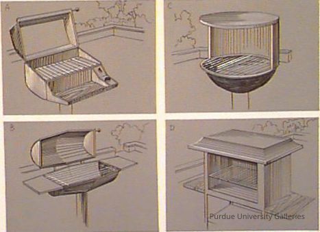 4 different grill designs labeled A through D. A is a rounded rectangle shape with hood and extra shelving space. B is shaped like a cylinder with the bottom half of a sphere as it's firebox. C is a cylinder with the middle pushed out to make an angle, which 2 shelves on the side. D is a box grill shape with 2 shelves on the sides and shelving underneath.Acquisition