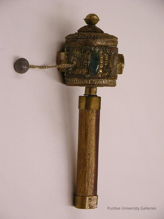 This prayer wheel is related to the presence of Hindu beliefs shared by a small portion of Afghanistan's populace. Its primary function is for repeating mantras. With each revolution, the prayers printed on the enclosed paper are offered."