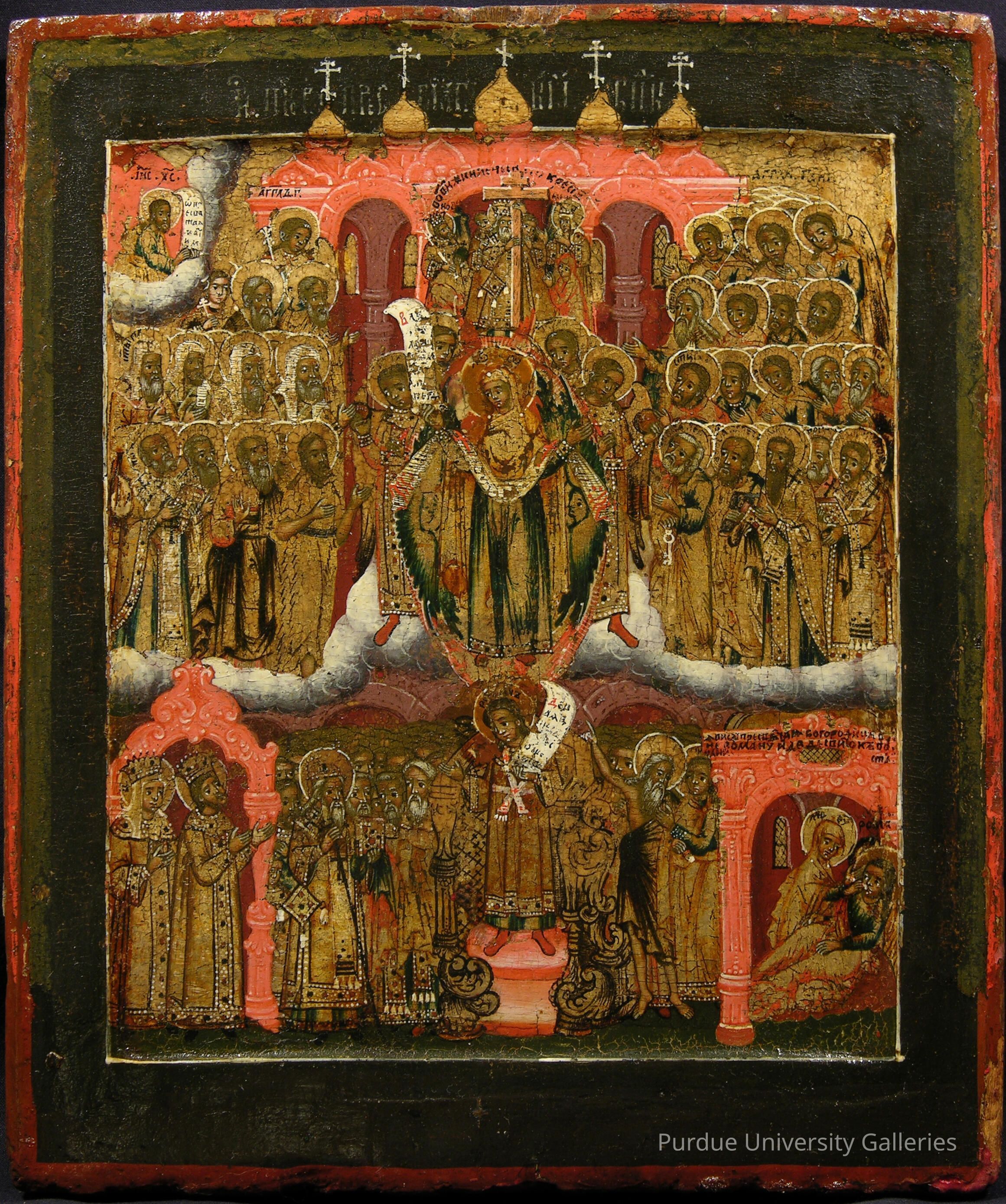 The word Pokrov (meaning both “veil” and “protection” in Russian) combines two stories celebrated in the Eastern Orthodox calendar on the same day, October 1st. It represents the miraculous appearance of the Mother of God in a church in Constantinople in 911 during a Saracen invasion. She is shown standing on a cloud with her arms outstretched in prayer, holding a veil which would protect the people below. A host of saints and angels surrounds her. The exterior of a five-domed church is indicated behind her, as well as a cut-away view into the interior. We can see columns, arches and leaded-glass windows, and a scene of the Presentation of the Cross appears above her head. St. Andrew, the Holy Fool for Christ’s Sake (dressed only in a blanket), points up at her on the right. The emperor and empress and the patriarch of Constantinople stand on the left. The second story involves the young man standing on an elaborate podium below the Mother of God, Romanos the Melodist, a composer of hymns shown holding a scroll with the words of his famous hymn to Mary. The scene in the lower right shows the Virgin offering a scroll to the composer during a dream, thus inspiring him. The colors used in this painting, dark green, brown, light ochre and red, are typical of late 17th-century icons.