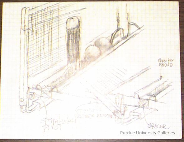 Pencil sketch of a prototype with moving parts. Some parts are labelled. It was drawn on graphing paper.