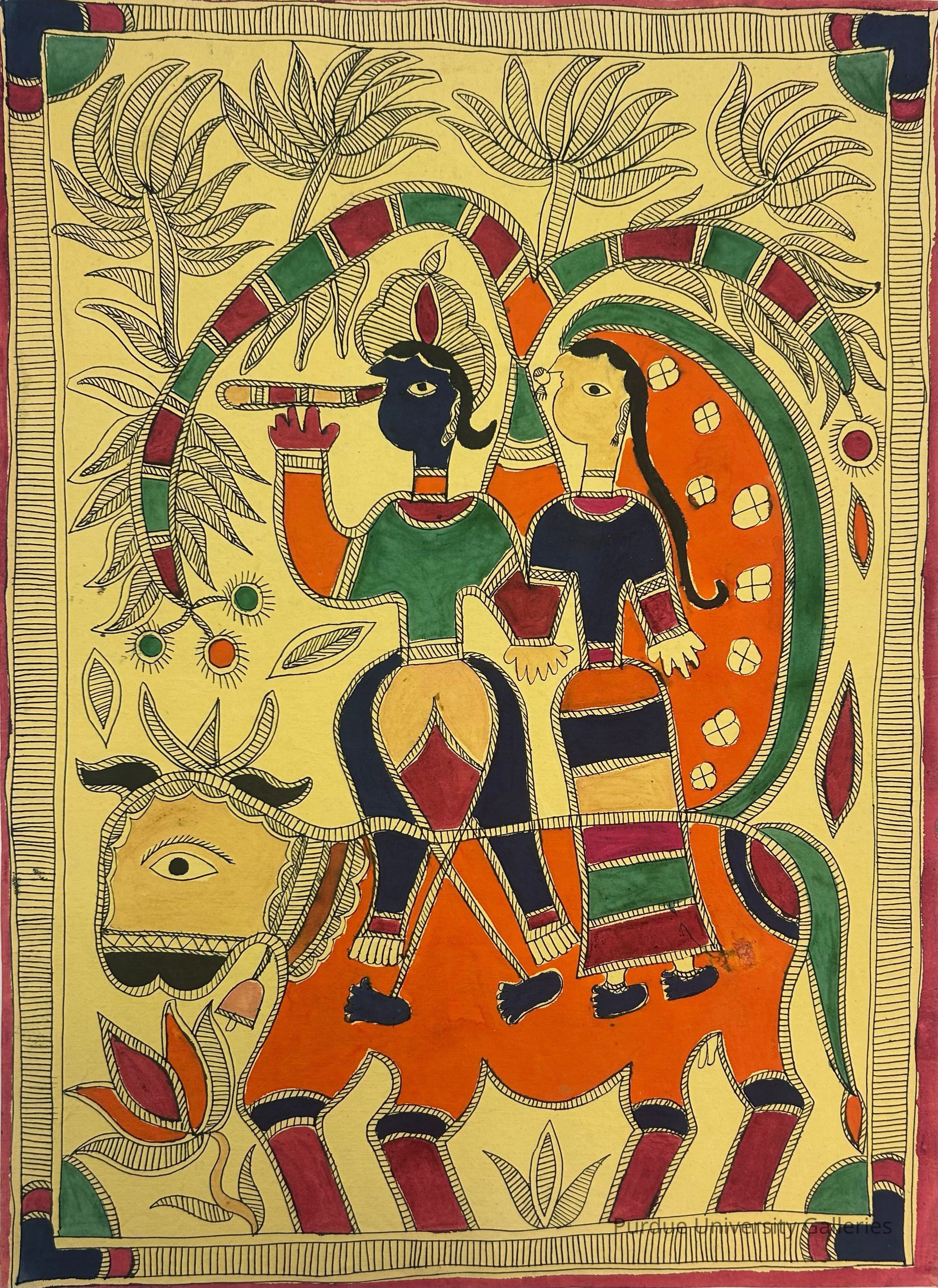 The painting depicts two figures, characterized by intricate patterns and vibrant colors, riding a large animal, possibly a bull, against a backdrop of stylized trees and foliage. The central figure, depicted with a darker complexion, plays a flute, with the companion figure by their side, both dressed in traditional attire.Type of Painting