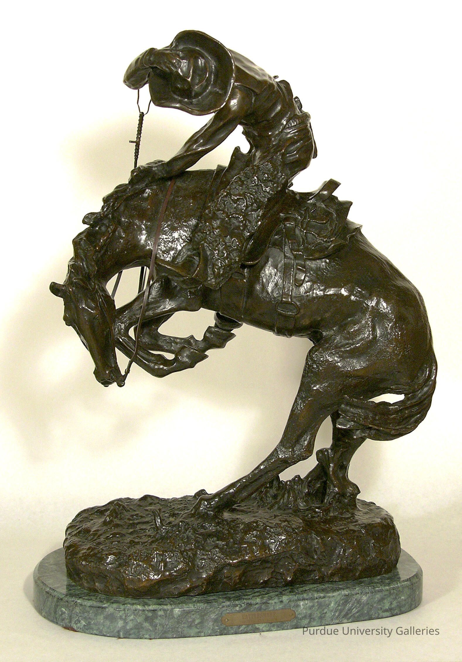 "Remington had such success with his first version of The Bronco Buster that he decided to produce a second one half again as large as the first. He wrote to Bertelli at the Roman Bronze Works that “this size lends itself to my hand much better than the smaller.”1 When the model was finished he sent off an enthusiastic note to the foundry. ""Say Bertelli, you ought to see the 11/2 Bronco Buster -- It will make your eyes hang out on your shirt. Get ready to retire the small one -- mind you.""2 1 Letter from Remington to Riccardo Bertelli, undated (1909), in the collection of the R. W. Norton Art Gallery, Shreveport, Louisiana. 2 Letter from Remington to Riccardo Bertelli, undated (1909), in the collection of the R. W. Norton Art Gallery, Shreveport, Louisiana. ------ 1999.13.01 & 1999.13.09 Frederic Remington was defined by the Old West. His obsession with the lives of countless Native Americans, cowboys, and military men drove him to attempt to recreate with vivid details the drama and danger of their daily life. Not surprisingly, he focused on equestrian due to their inherent danger and beauty. Several of his bronze sculptures represent horses and horsemanship in their finest details. Remington enjoyed great success despite the fact that he had very little formal training in sculpture. He extended the possibilities of what bronzes can show as demonstrated by The Outlaw: the artist relished the challenge of pushing boundaries. He wrote to the head of the Roman Bronze Works, Riccardo Bertelli, a post card with a sketch of a bucking horse and rider and under he wrote this conversation, “R: ‘Can you caste him?’ B: ‘Do you think I am one of the Wright brothers?’” Remington took a realistic view in The Outlaw. The cowboy sits leaning backward precariously on his steed struggling to maintain his balance and control, as his steed rears right into the curve. The riders face is frozen in a determined and confident expression, while in contrast the horse is frantic with energy and terror. The arching lines of the sculpture convey the excitement of the action, with the cowboy twisted in his saddle. We have the illusion that the bronze is alive and simply frozen at the peak of drama. Frederic Remington used realism extensively throughout his bronzes. The textures and details of the rider and horse are painstakingly depicted by Remington. He wanted to bring his idea of the Old West to the modern world of the East Coast. Like most of his other works, The Outlaw demonstrates Remington’s careful attention to the anatomy horse movement and the riders mastery over them. Frederic Remington created The Outlaw as a companion pieces to the The Broncho Buster. They are like a teeter-totter, creating a fluid flow from the start to finish of the horses bucking motion. Bibliography: Remington1960: [PAGE #s]; Hassrick 1973: [PAGE #s] ; Shapiro1981: [PAGE #s]; Hassrick 1988: [PAGE #s]; Remington 1993: [PAGE #s]; Nemerov1995: [PAGE #s]; “Frederic Remington (1861-1909).” http:// www.christies.com/LotFinder/lot_details.aspx?intObjectID=5154232; Amon Carter Museum, “Works of Art.” http://www.cartermuseum.org/works-of-art/1999-22 Submitted by Eric Engle"