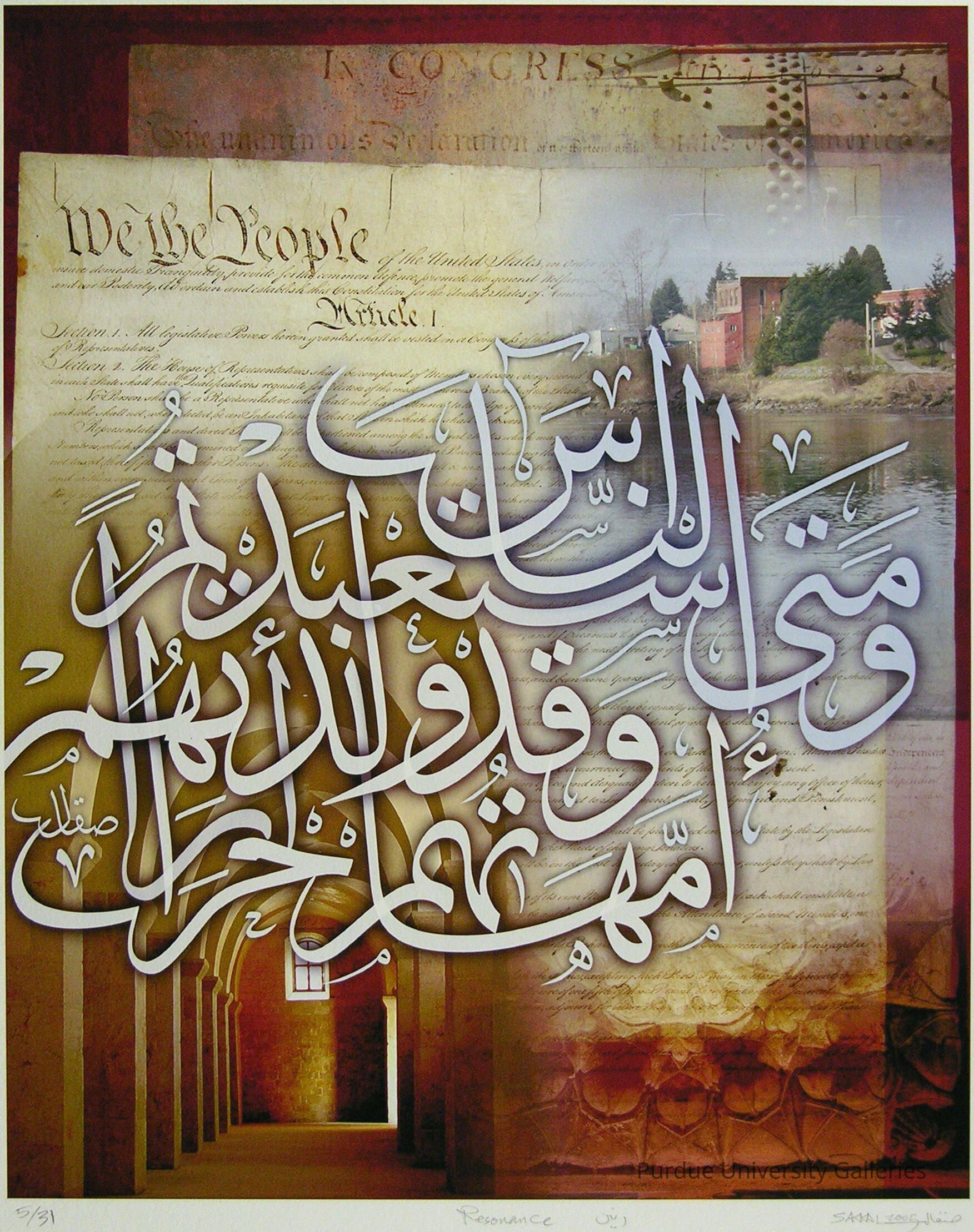 "Mamoun Sakkal has exhibited throughout the United States as well as in England, Syria, and Iran. Recently his art was displayed in ""The First Painting Biennial of the Islamic World"" at the Teheran Museum of Contemporary Art in Iran. Mr. Sakkal is a native of Aleppo, Syrai. He immigrated to the United States in 1978. He practices architecture, interior design, and graphic design, as well asprincipal of Sakkal Design School in Bothell, WA. He also teaches Islamic Art and Architecture for the University of Washington. His many awards include the first award in Kufi style in the Third International Calligraphy Competition in Turkey.