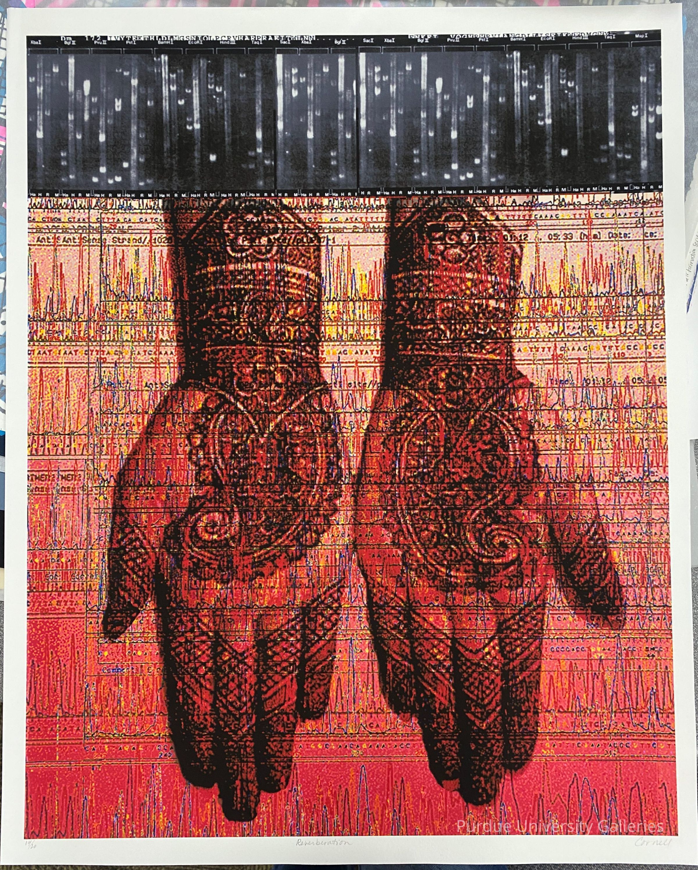 Two hands held out palms up and covered in henna. Red background overlayed with sound waves or medical chart readings in blue, yellow and red.Type of Print