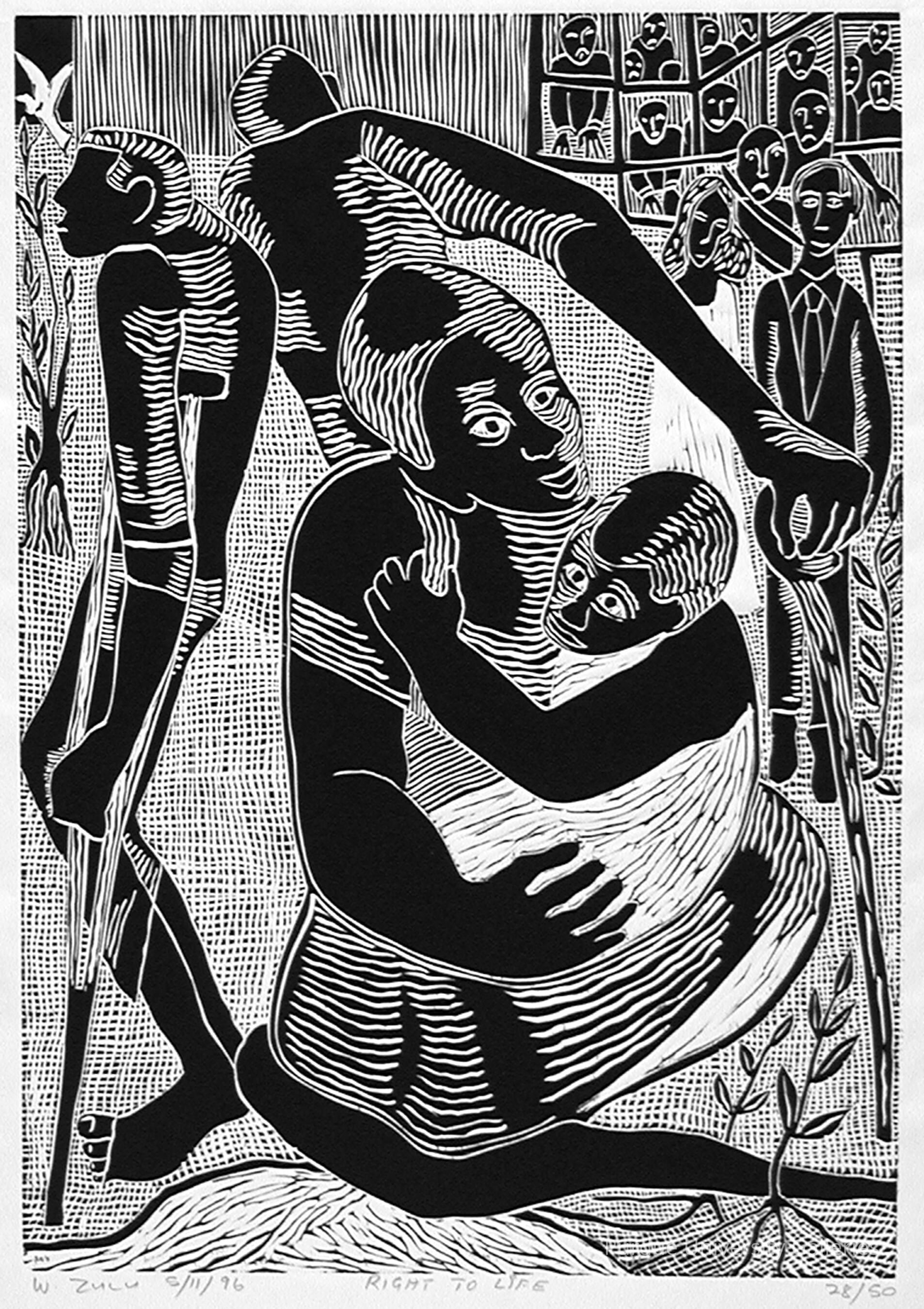 "(The Right to…) LIFE William Zulu Emondlo/KwaZulu-Natal linocut “Everyone has the right to life.” "