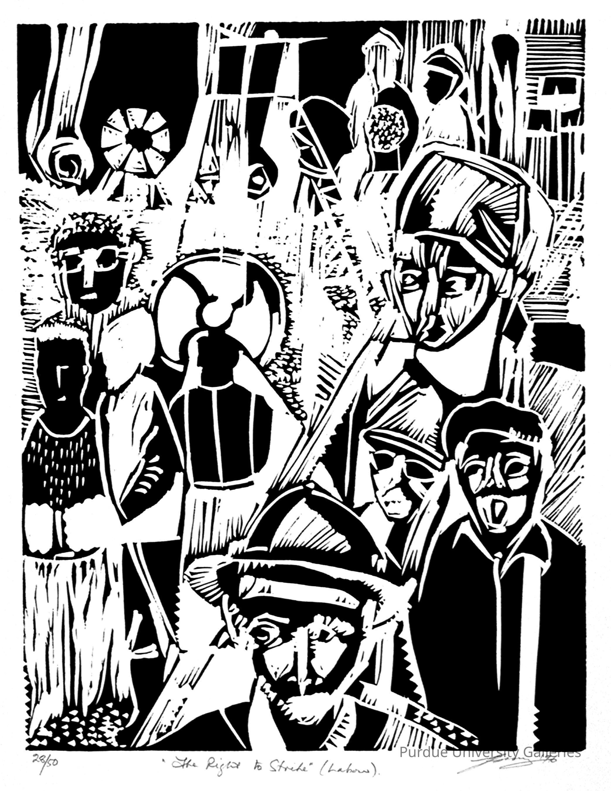"(The Right to…) FAIR LABOUR PRACTICES Edwine Simon Cape Town/Western Cape linocut “Workers have right to form and join trade unions, to participate in their activities and to strike, while employers may form employers' organization, and participate in their programmes.” "