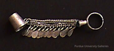 Combining a ring and thimble by decorative chains is a well conceived idea for a nomadic woman as a means to prevent loss of an important tiny tool.