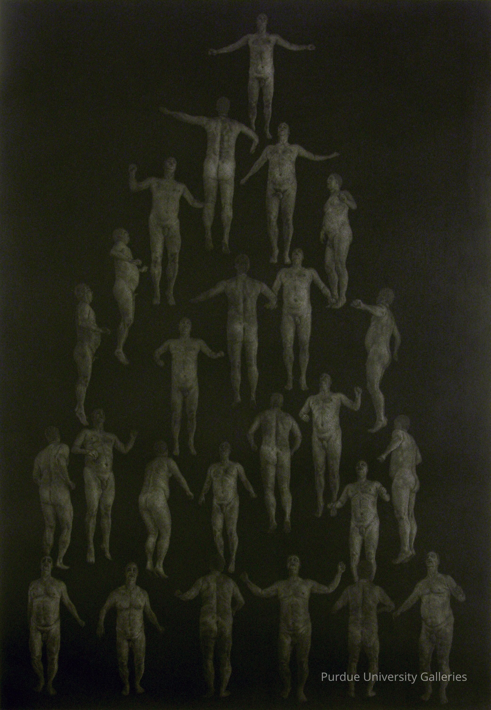 Etching of a human pyramid of one middle aged man, nude, in various positions. Monochrome in color and fairly dark in exposure.