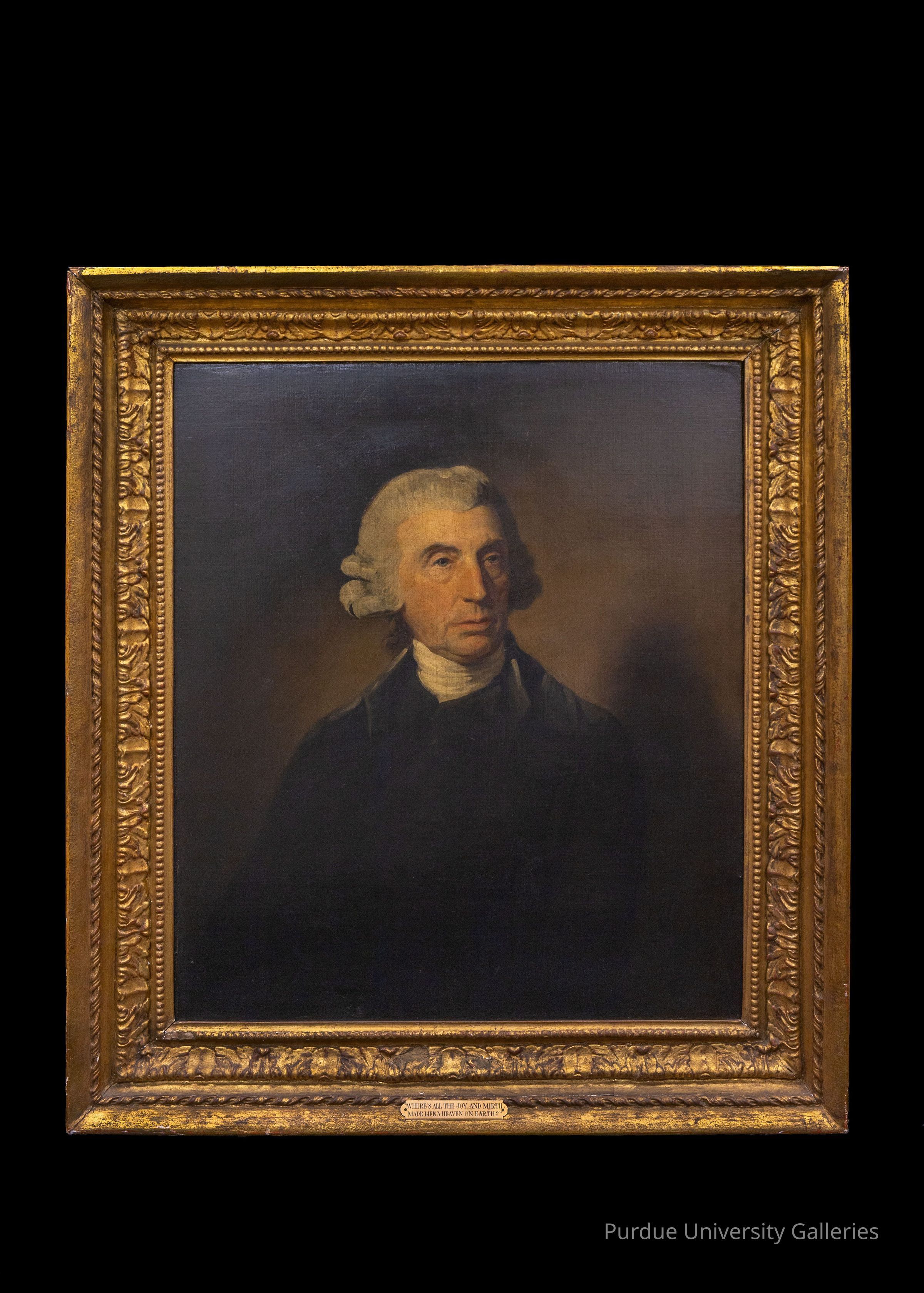 The image features a classical oil painting of an elderly man displayed in an ornate gold frame, set against a dark background. The subject, portrayed with a solemn expression, wears a black coat and white neckcloth, and his white hair is styled in a period-appropriate manner. A plaque at the bottom of the frame identifies the subject as being 73 years old and hints at his notable intellectual contribution, though his exact identity is not disclosed in the image. The overall presentation suggests the painting's significance