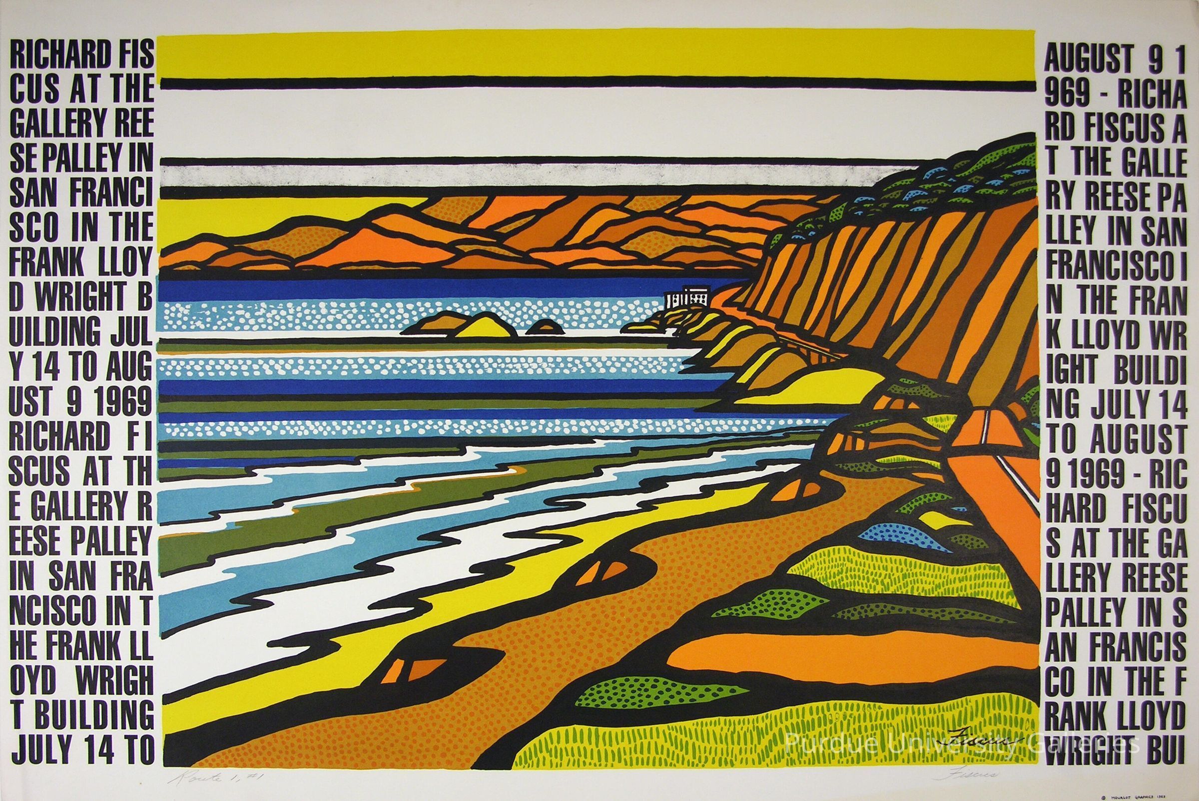 An illustration flanked by a wall of text reading " RICHARD FISCUS AT THE GALLERY REESE PALLEY IN SAN FRANCISCO IN THE FRANK LLOYD WRIGHT BUILDING JULY 14 TO AUGUST 9 1969" and thus restated continuing onto the left panel. Illustration displays a highway between a cliff side and shore with a white building in the background.