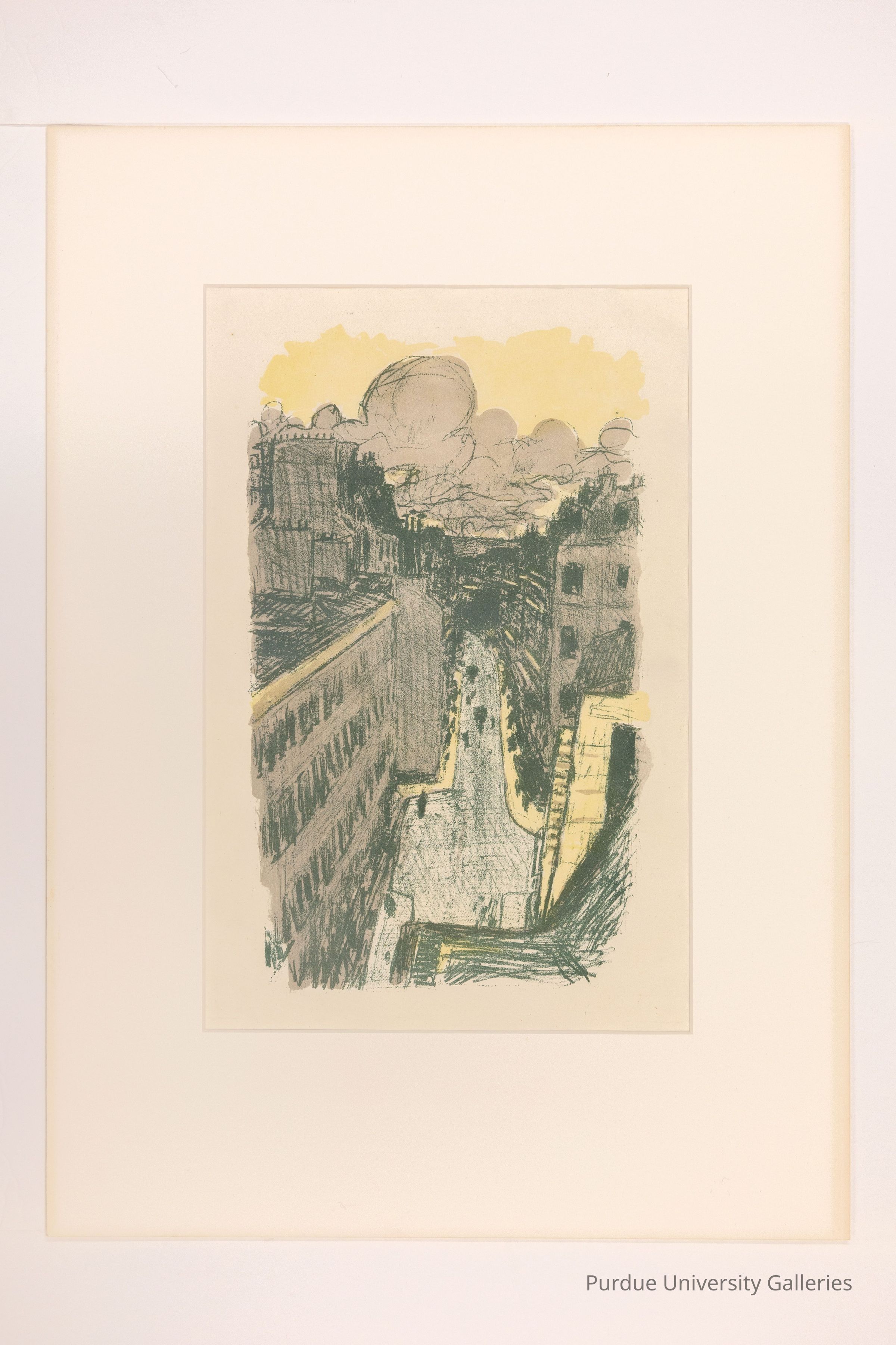 Paris, Street Scene from Above is shown from a raised perspective, looking out of a window or from a rooftop toward Parisians in the street below. The most prominent color is yellow, used for clouds and for sidewalks lining the street. Although figures are present, one can not see any distinct features. The figure in the middle of the street seems to be carrying an umbrella since a circle is indicated where the head should be. The apartment buildings in this print frame the scene and make the viewer focus in the figures on the street. This lithograph is executed rapidly, making the overall composition appear unified. Pierre Bonnard created lithographs that are immediate and spontaneous, and that deal with everyday events rather than emphasizing individual figures. Bonnard worked in the era of Art Nouveau. It was an international art movement emphasizing organic shapes and having roots that go back to Romanticism, Symbolism, and the English Arts and Crafts Movement.