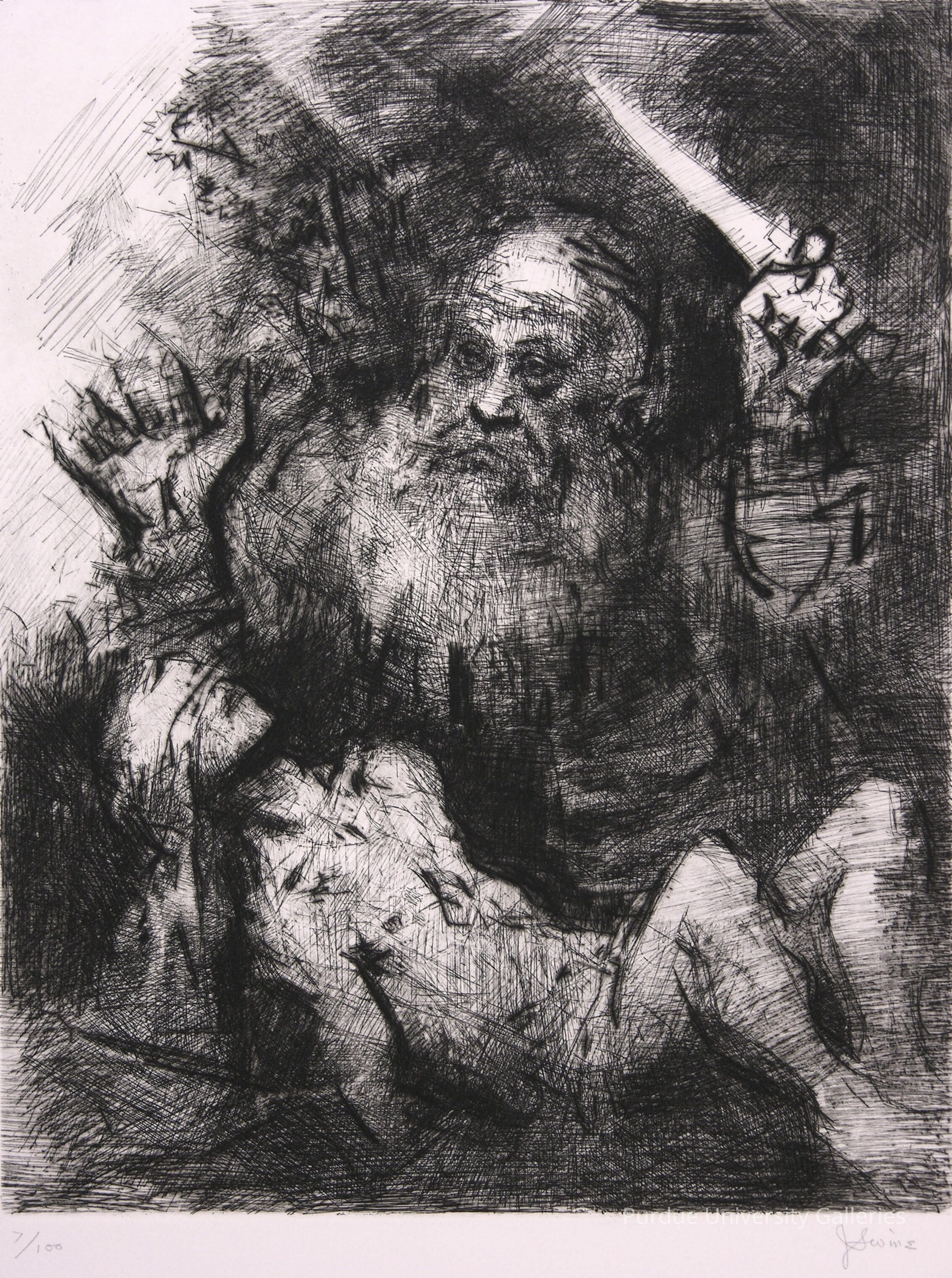 "Born in Boston, Levine developed an early interest in art and trained at the Boston Museum School. He went to Rome to study in 1932, and, from 1935-1940 he worked as a Federal Arts easel painter. During his career he has taught at the American School of Art in New York, the Pennsylvania Academy of Fine Art, Skowhegan School of Art, Cleveland Museum of Art, The Art Institute of Chicago and the University of Illinois. His artistic style is based upon that of Expressionists of the Ecole de Paris such as Soutine and Rouault but the subject matter of his art is primarily social satire and he belongs to the school of Social Realists. The restless, flickering strokes of his etching needle energizes the present print and draw figure and ground together. The contrasting shadows of dense crosshatching, rich drypoint blacks and bare white ground contribute to the solemnity, power and tension of this image.