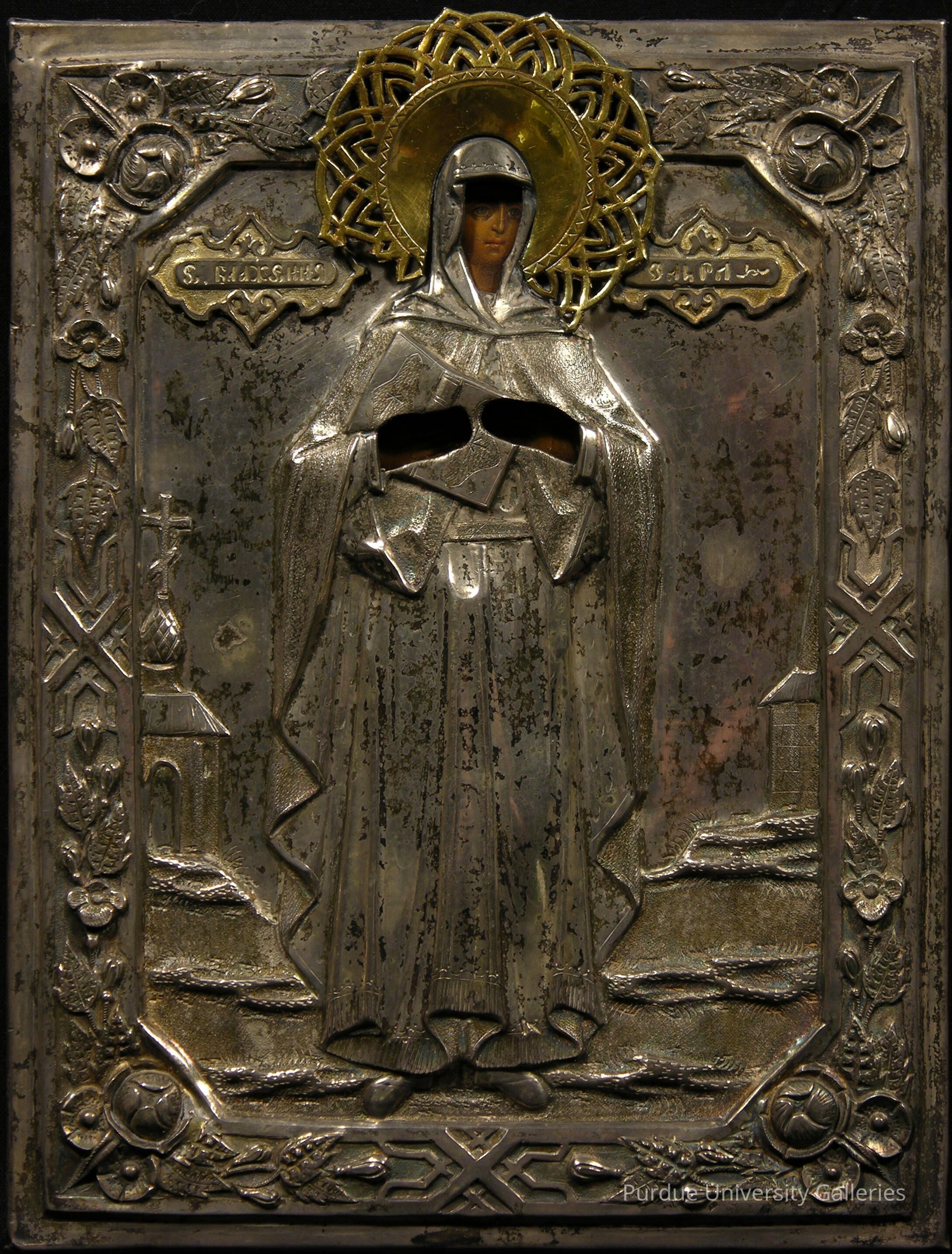 Olga was the first Russian saint, who had become Queen of Ukraine in 945 after the murder of her husband Igor. She was ruthless in avenging his death. Later, she visited Constantinople, where she learned about Christianity and charmed the Byzantine emperor, who wanted to marry her. She agreed, if he himself baptized her. Afterward, she cleverly avoided matrimony by claiming that the emperor could not marry her since he had called her his daughter in the ceremony. Olga returned to Kiev, where she worked to establish the Christian religion. When her grandson Vladimir became king, he completed the Ukrainian conversion to Christianity, including that of his two sons, Sts. Boris and Gleb. Olga’s feast day is celebrated on July 11. This icon is almost completely covered with a silver riza which is engraved and worked in repoussé. Only Olga’s face and hands (painted on the panel below) show through. St. Olga is seen standing and holding a Gospel in both hands. She is dressed in a voluminous gown with a hood, more like a nun’s habit than a queen’s robe. She seems to be standing symbolically on a cloud, since behind her there can be seen the tops of buildings, including a church tower with a cross on its peak. A large halo in metal surrounds the saint’s head. The border of the riza has a decorative floral pattern.