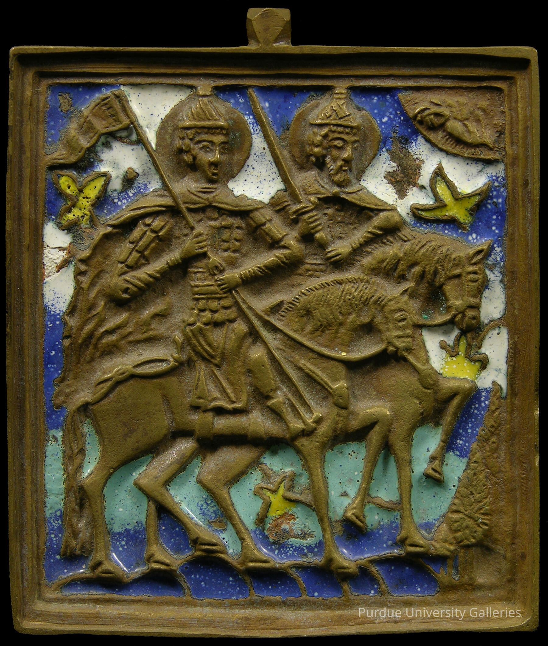 For an iconographic description, please see 2005.02.092. This small plaque is similar in composition to the painted version of the same theme in this exhibition, except that the younger, beardless saint here appears in the foreground. The figure of Christ is abbreviated to show only the hands. The enameling displays blue and white for the sky and clouds, with yellow stars.