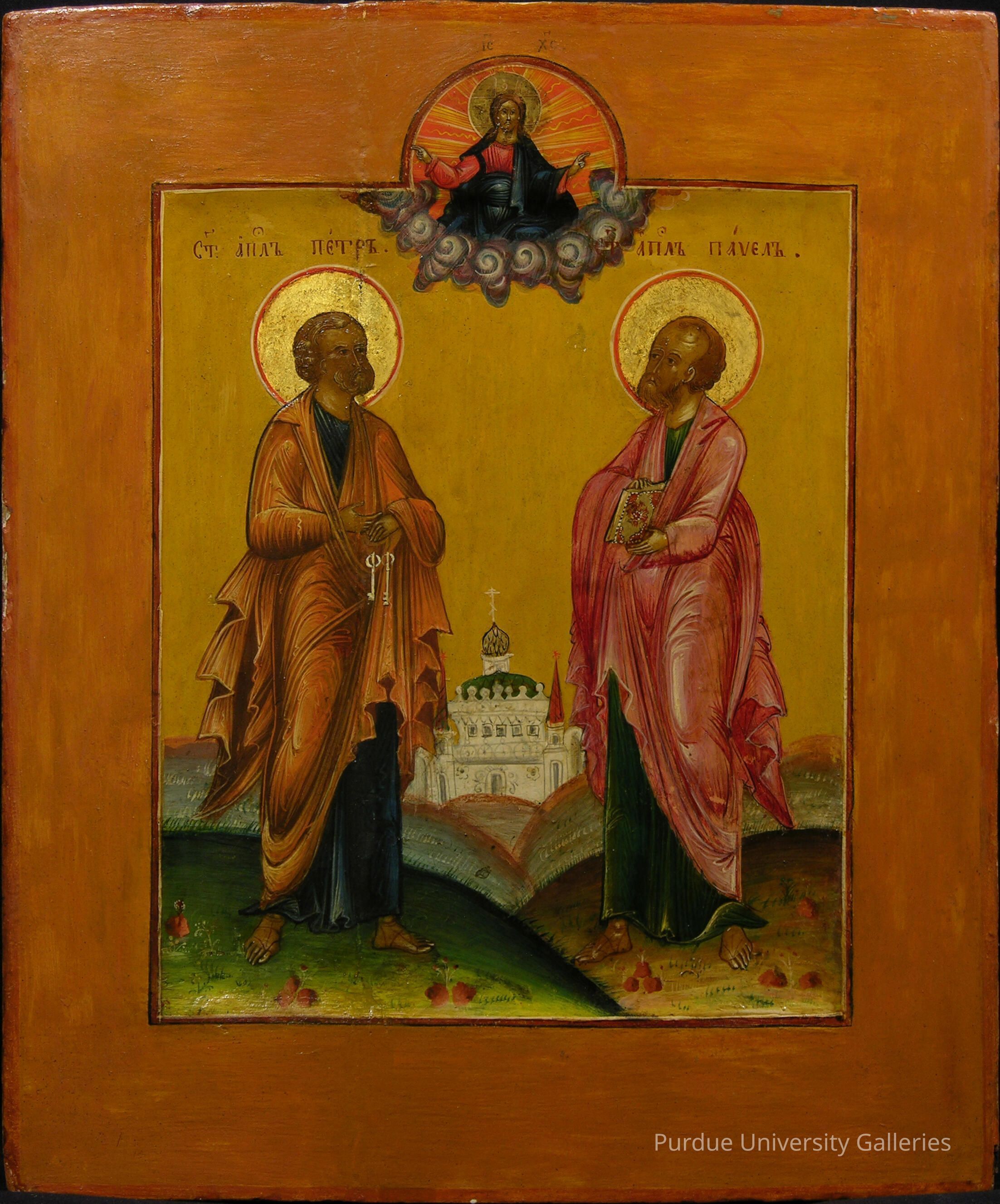 Saint Peter is on the left, holding his characteristic attribute of the keys. These indicate his status as the first leader of the church, designated by Christ as the “rock” on which he would build this institution. St. Paul stands on the right, holding a book of his writings. He was not one of the original twelve disciples, and was converted to the Christian faith by a blinding light from God while traveling on the road to Damascus to persecute Christians. Paul became a preacher and a missionary, traveling extensively and writing his Epistles (cf. 2005.02.004). In the clouds above Paul in the icon, Christ appears with his hands outstretched in blessing. An onion-domed Russian church is visible between the two saints in the distance. The figures turn slightly toward each other and gaze at Christ above. One notes the stylized rocks at the saints’ feet that reflect the pink of their robes.