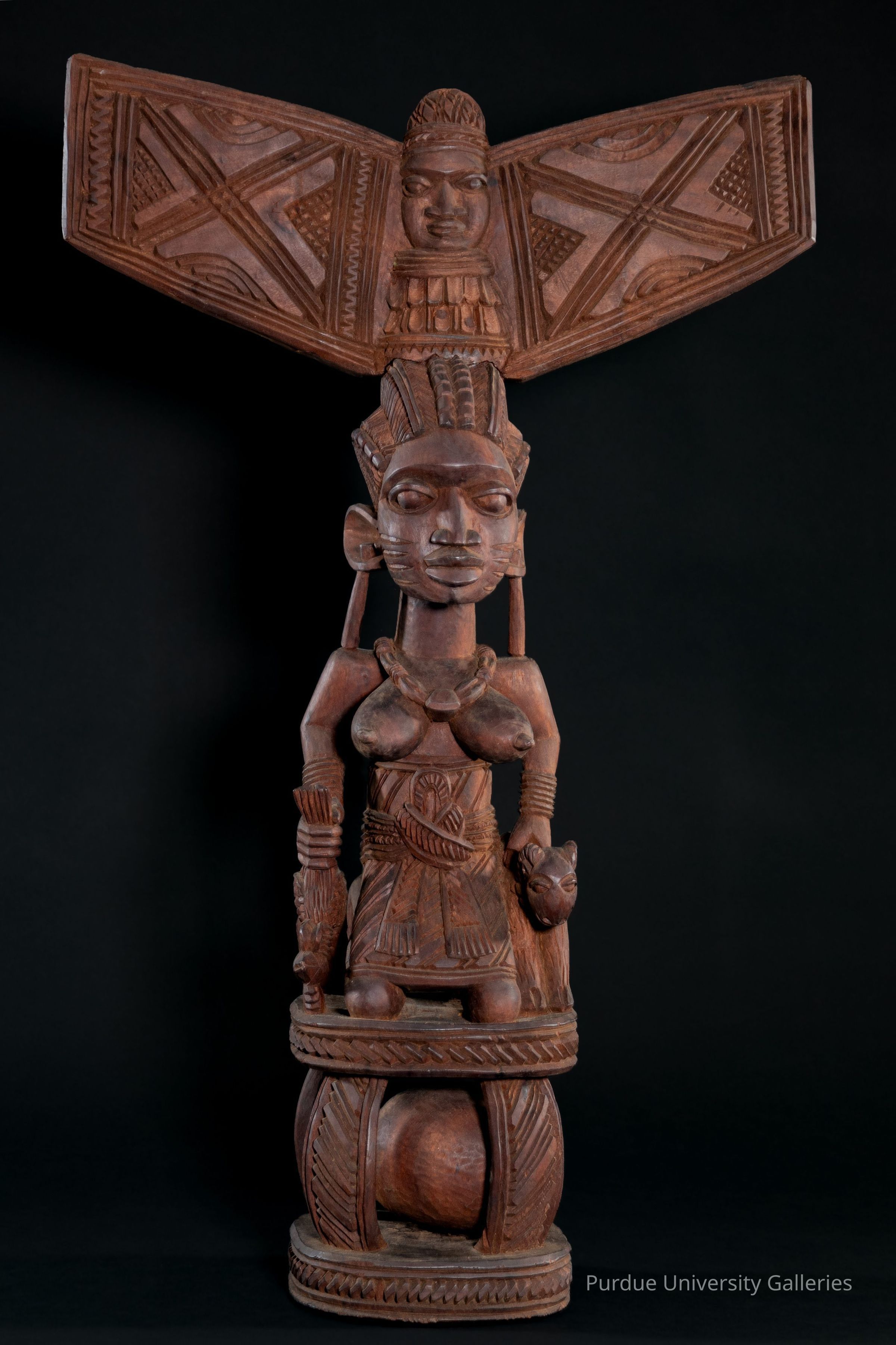 In “Sango Worshipper with Ose,” (aquired by Purdue, 1994) we see the element of tenderness: a woman securing her child. Upon her head the winged headdress signifies the god of thunder. She restrains ram and cock, intended for sacrifice. Fakeye carved from oroo, a modern African mahogany not traditionally used. Its satiny finish comes from apprentice-work, smoothing the surface with knives for approximately forty hours. The ball carved out of the base demonstrates his technical virtuosity."