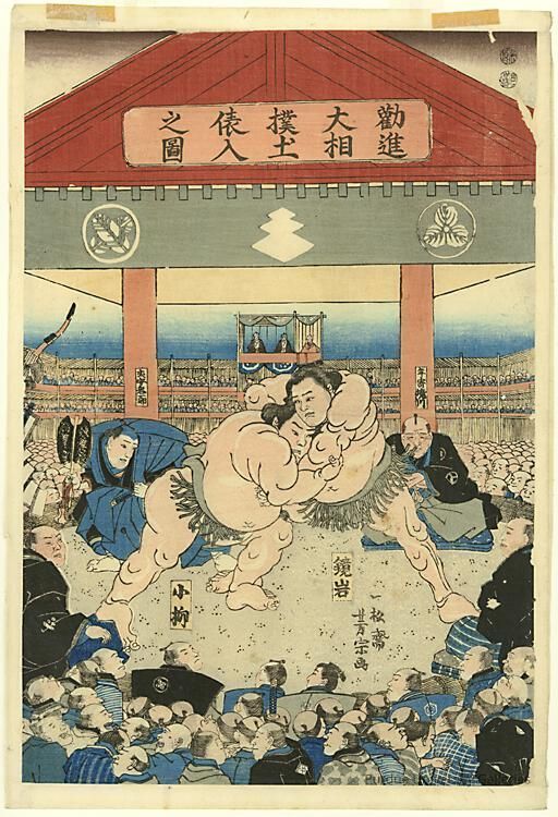 Artist was pupil of Utagawa Kuniyoshi. Almost all of Yoshimune's prints are images of warriors or scenes of Yokahama. Although the wrestler was the most popular public entertainer, next to the actor, very few artists depicted them. Wrestler on left: Koyanagi; Wrestler on the right: Kagamiiwa.