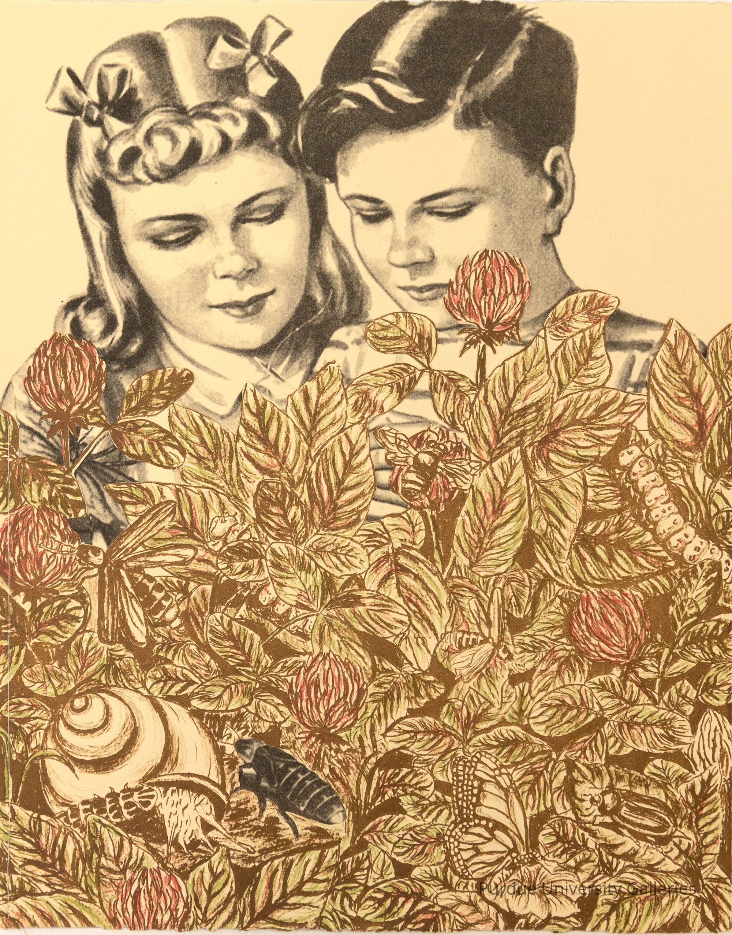 Black and white print of boy and girl in a c. 1950-style exmining a threaded needle - the spool of thread is in front of the boy. On the girl's should is a spider with wings, in the bottom, right hand corner is a praying mantis with butterfly wings, and iin front of the boy is a beetle in a jar. Machine-stitched along the left-hand side of the print is a second print of a bush with cutouts of the beetle and winged-spider. Also in this print are flying insects, a slug in a shell, butterfly, bee, catepillar and other insects. The print is colored in with green leaves and red flowers. On the back of the print with the boy and girl, along the bottom edge in pencil "Sceince for Modern Living, 6/24, Haylee Ebersole"Type of Print