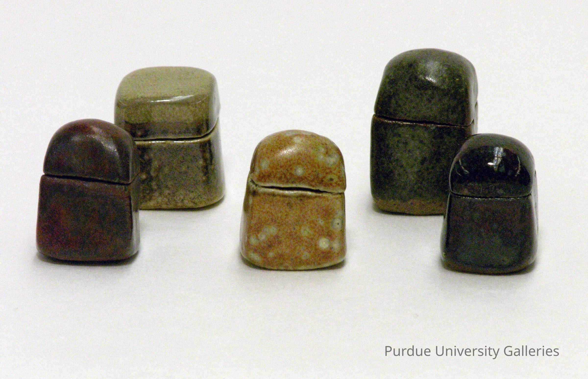 Small ceramic vessels. They all mainly match each other's shape and size. The glazes vary slightly. All mainly brown, but have slight shifts in green, yellow, red and black. The glazes speckle and do not give one specific plain color. The boxes all are rounded rather than usual geometric boxes.Type of Sculpture