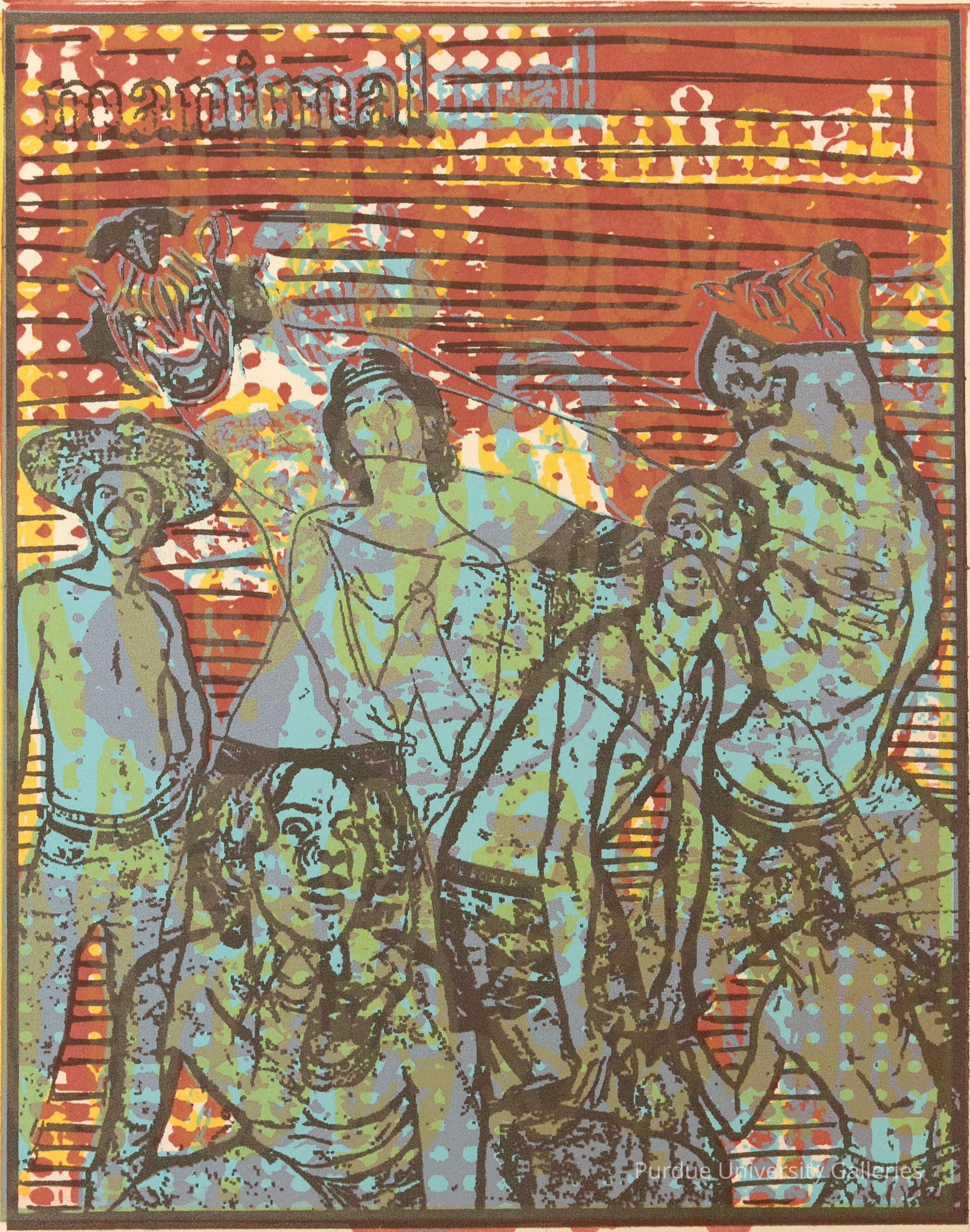 Double-sided print. Front side is red and blue/green with image of the same man outlined in black. In various poses he is shirtless and has the faces or snouts of animals over his face like a mask. Along the top of the print the workd "manimal" is repeated at least 3 times. On the reverse side in brown ink is image of same man nd a second man's head advertizing surgery to make physicalogical changes. Along the botot edge of this side in pencil "Shake What the Doctor Gave You, 6/24, Justin Maes"Acquisition
