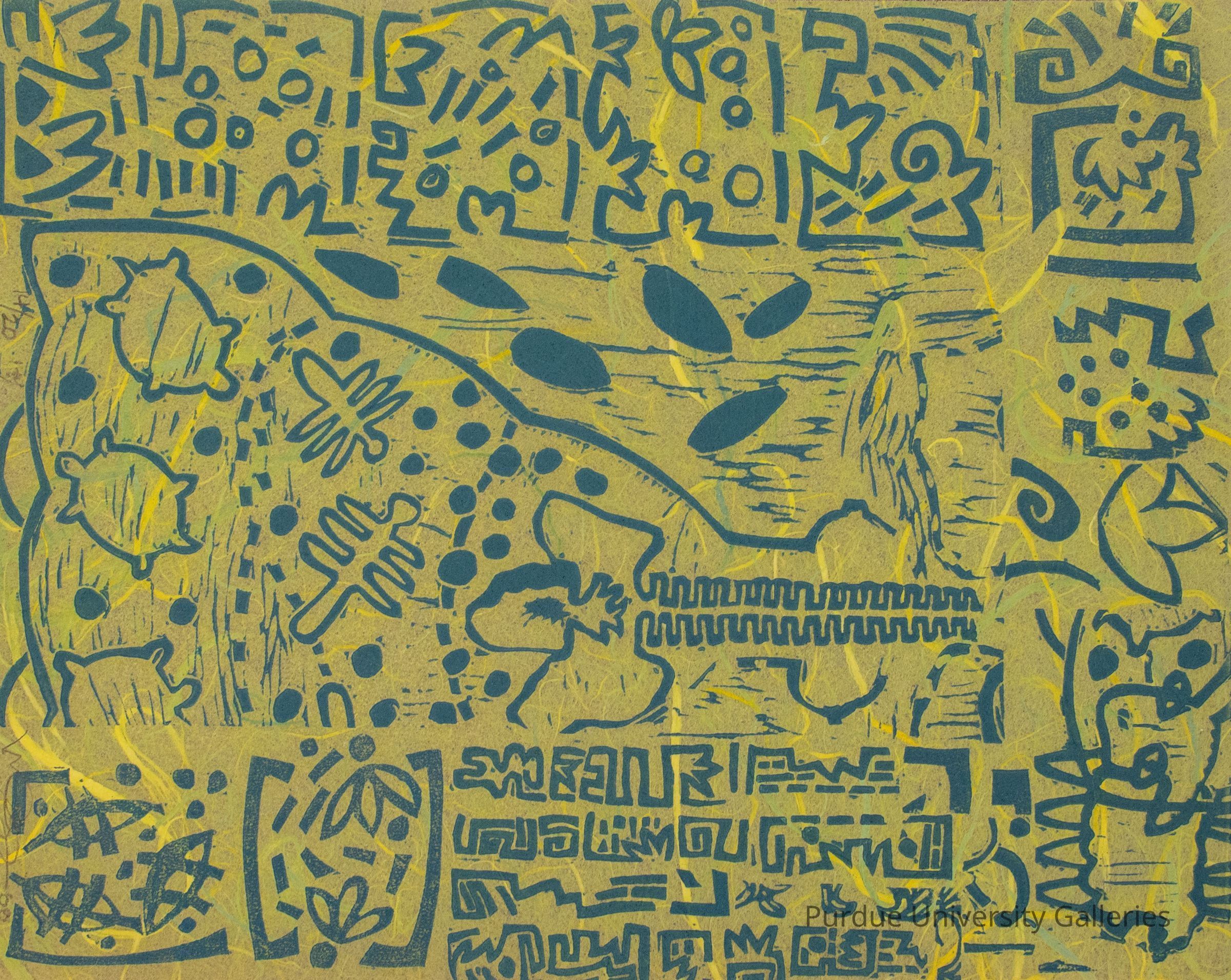 8" x 10" green-yellow tissue paper printed with blue-green ink composed of turtles, dragonflies, animal backbone, flowers, seeds and water images. On the turtle side edge in pencil is "14/20," and the artist's signature in the bottom right corner.