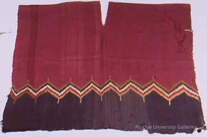 Fiber, alpaca. Large shirt fragment, Inca style, woven in warp face plain weave with discontinuous warps in step design. Colors include red, gold, brown, white, and yellow. Although it appears to be an entire tunic with a cut slit, it is actually only the right half of the original garment.Acquisition