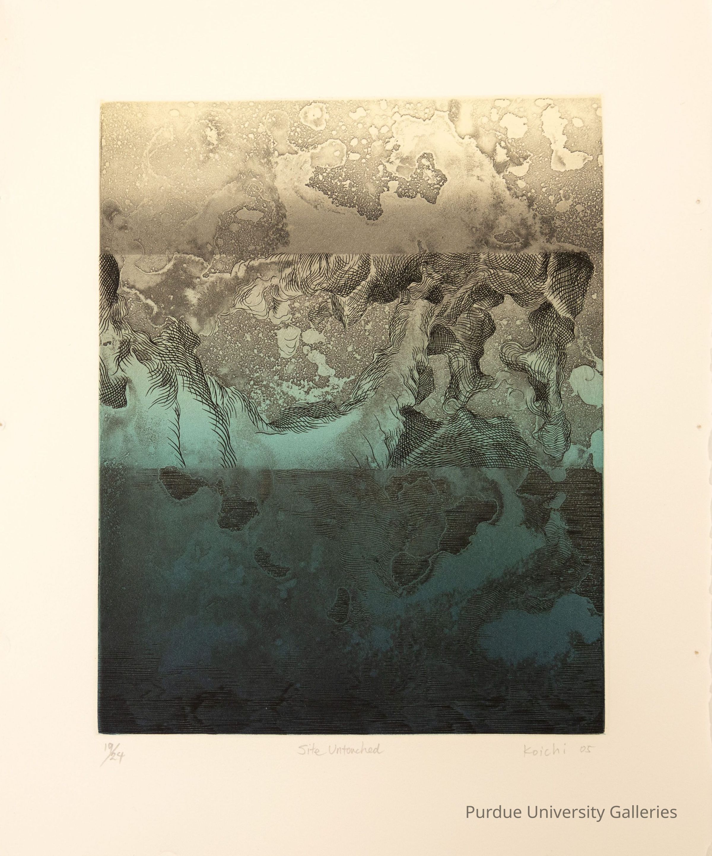Print in 3 distinct areas (dark blue - almost black lower 1/3; an aqua color in the middle 1/3; black and white in the upper 1/3). The print has the appearance of a stormy sea or a galaxy in motion. On the paper below the print in pencil is written (from left to right) "19/24, Site Untouched, "Koici 05". Along the left hand side are 5 perferations suggesting the page was once in a bound portfolio. On the back in the bottom right quadrant in pencil is "(c) Koichi Yamamato."Type of Print