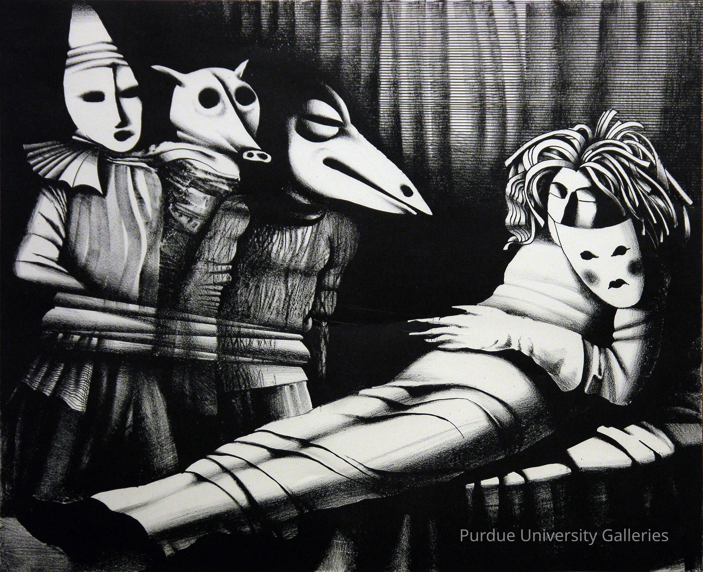 "For forty years, Dragune has produced illustrated books, lithographs and watercolors at her home in Riga, Latvia. Her graphic compositions are mainly landscapes that have a romantic theme with a strong sense of human presence. But the work here contains a macabre sense of the surreal and the sense that the sleeping individual is safer in her dreams than with the impending danger of those characters lurking beside her. However, as they themselves are bound together, and masked as she herself was, perhaps they too are victims of an unknown menace and are simply waiting for her to awaken..."