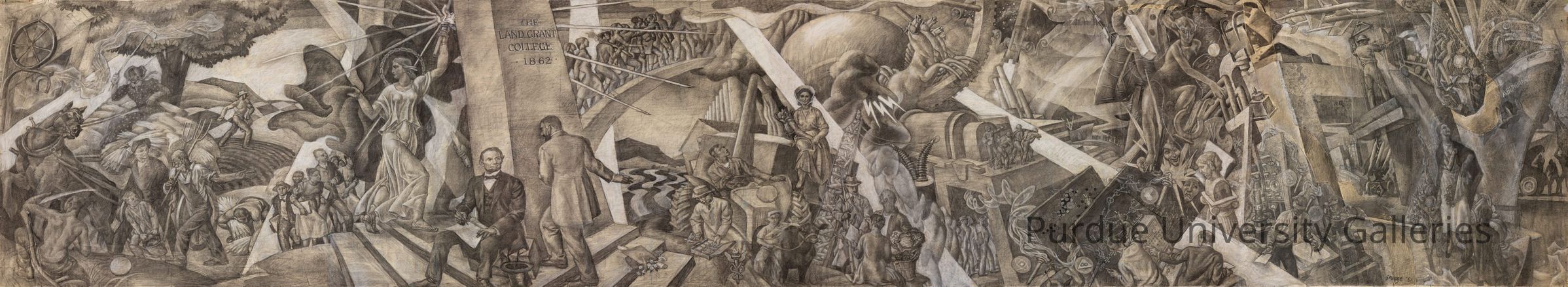 If you guessed the Spirit of the Land Grant College mural in HSSE, you would be correct. Hoosier artist Eugene Savage (1883-1978) was hired to paint the iconic mural for the newly built Stewart Center in 1961 showing the progress of higher education from the 19th century through the 20th century. For a useful explanation on the narrative, check out Purdue University Libraries’ website (https://www.lib.purdue.edu/libraries/hsse/spiritlandgrant). While planning the composition, Savage drafted a preparatory sketch in charcoal and pencil, known as a cartoon, and that sketch is the newest piece in Purdue’s art collection.